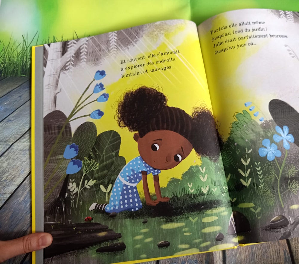 Gros coup de coeur pour les illustrations qui sont absolument magnifiques. Le style est à la fois moderne, pétillant et lumineux. C’est tout à fait le style que j’adore. La petite Julie est adorable et très expressive. Bref c’est parfait en tout point. Je suis complètement fan !