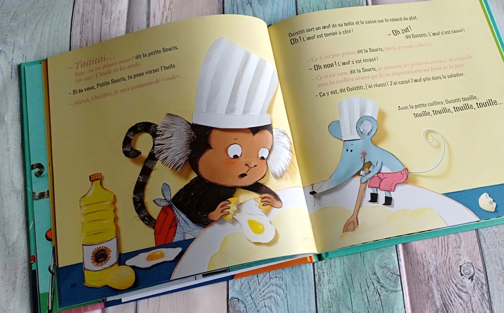 – On re trouve ici, Ouistiti, un petit singe qui veut cuisiner comme son papa. C’est accompagné de son amie la souris que Ouistiti va faire son gâteau. Il va faire les grandes étapes, seul, comme un grand et la souris va l’aider à trouver les ustensiles et tout ce qu’il faut pour préparer un délicieux gâteau. Une histoire aussi amusante que délicieuse.