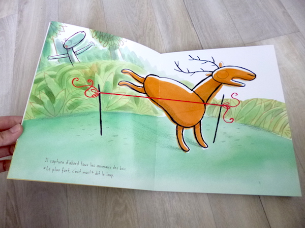 Ce livre pour enfants est vraiment très sympa et possède un petit côté original qui va beaucoup plaire aux jeunes enfants. En effet, comme vous pouvez le voir sur la couverture, le loup tient un élastique rouge dans ses mains. cet élastique se poursuit de page en page. Il est un peu le fil conducteur de l’histoire, celui que l’enfant suit au fil des pages. De plus, il a une place centrale dans l’histoire.