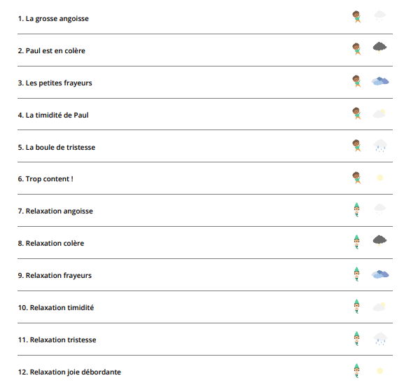 En tout il y a 12 écoutes possibles que ce soit des histoires à écouter pour comprendre les émotions, ou bien des petits exercices à pratiquer pour se relaxer avec dodo. Peu importe l’émotion ressentie, il y a forcément une histoire qui correspondra à ce que l’enfant ressent sur le moment.