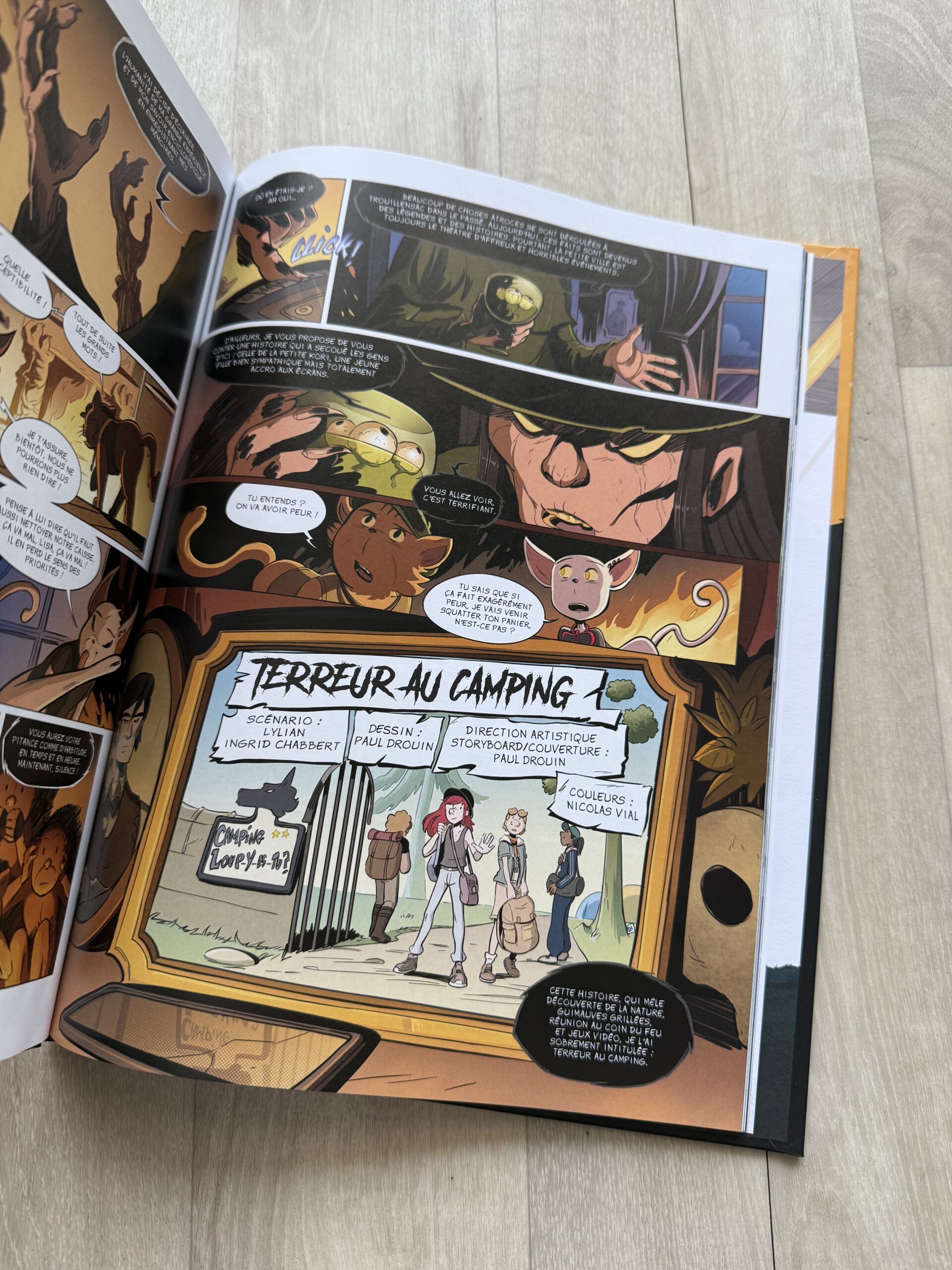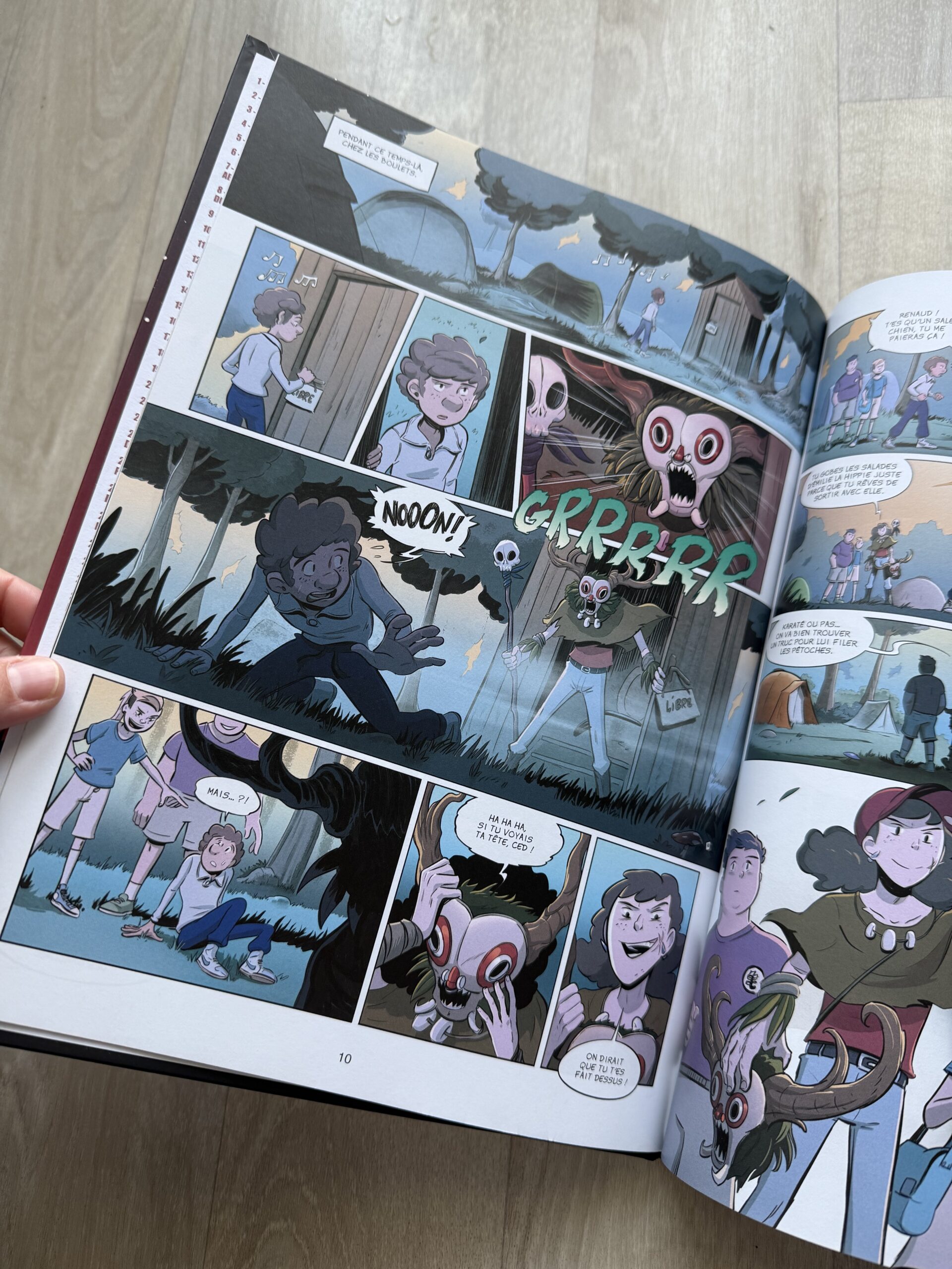 Présentation de cette BD : Inscrite à un week-end nature au camping de Trouillensac, Kori, 11 ans, addict aux écrans, rencontre Timéo. Mais au lieu de profiter du séjour, elle joue sur son téléphone et épuise sa batterie. Pour en trouver une autre, les enfants se lancent dans une virée nocturne et traversent la forêt. Malheureusement pour eux, elle est le repaire de démons et de monstres voraces…