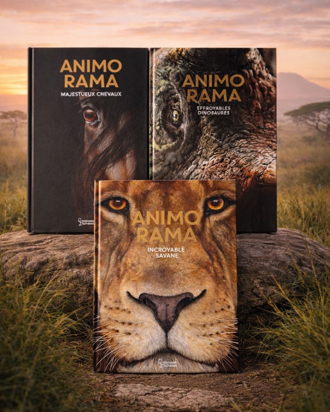 Il y a des livres qu’on remarque immédiatement dans une bibliothèque… et les ouvrages de la collection Animorama en font clairement partie. Grand format, couverture cartonnée, photographie en gros plan absolument saisissante : dès le premier regard, on est happé. Que ce soit avec Incroyable Savane, Effroyables Dinosaures ou Majestueux Chevaux, chaque titre met à l’honneur un univers fascinant et invite à une véritable immersion au cœur du monde animal.