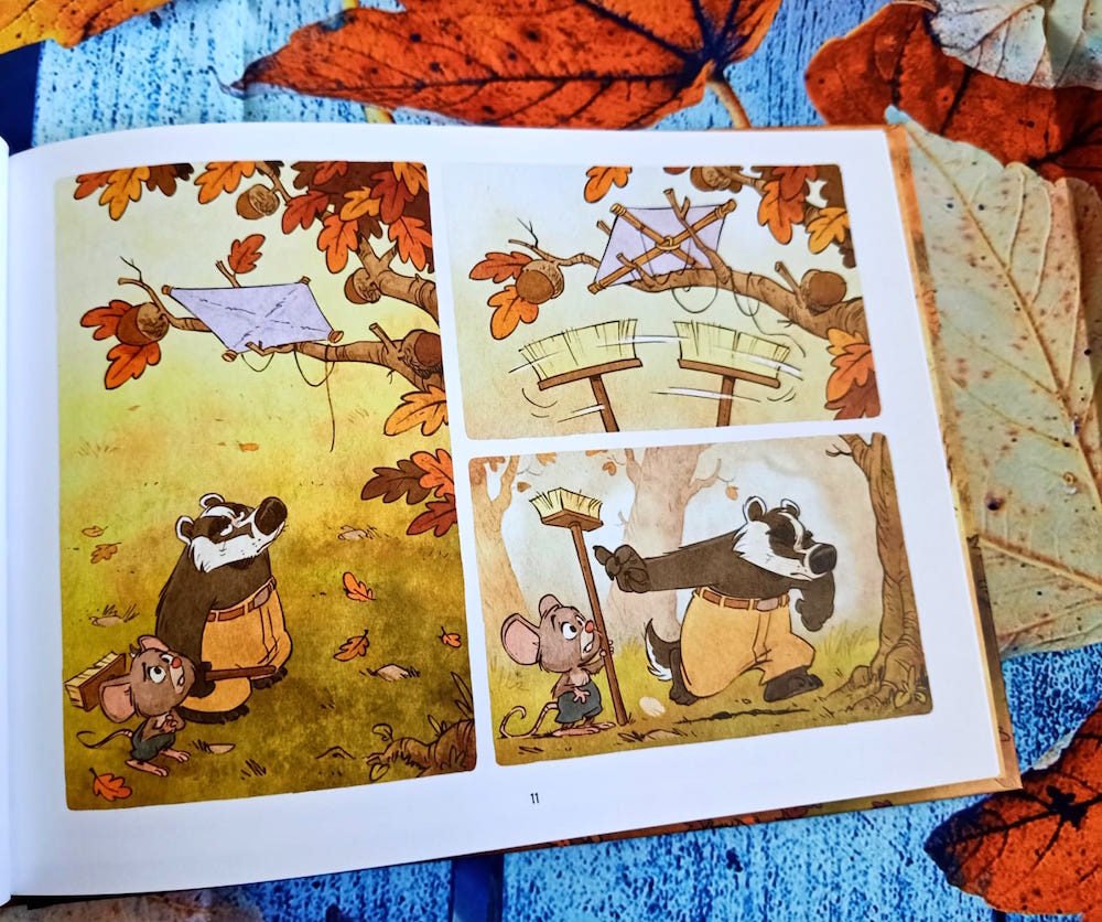 Présentation de cette bande dessinée : L’hiver approche à grands pas et tous les animaux de la forêt sont en pleins préparatifs : rangement, provisions, derniers vers avec les voisins… Tous les animaux ? Pas vraiment… Un blaireau bien connu du voisinage ne réussit pas à finir de balayer les feuilles mortes sur le pas de sa porte… Tout le monde vient le déranger… Grumpf ! Mais, finalement, la gentillesse de ce doux râleur sera récompensée.