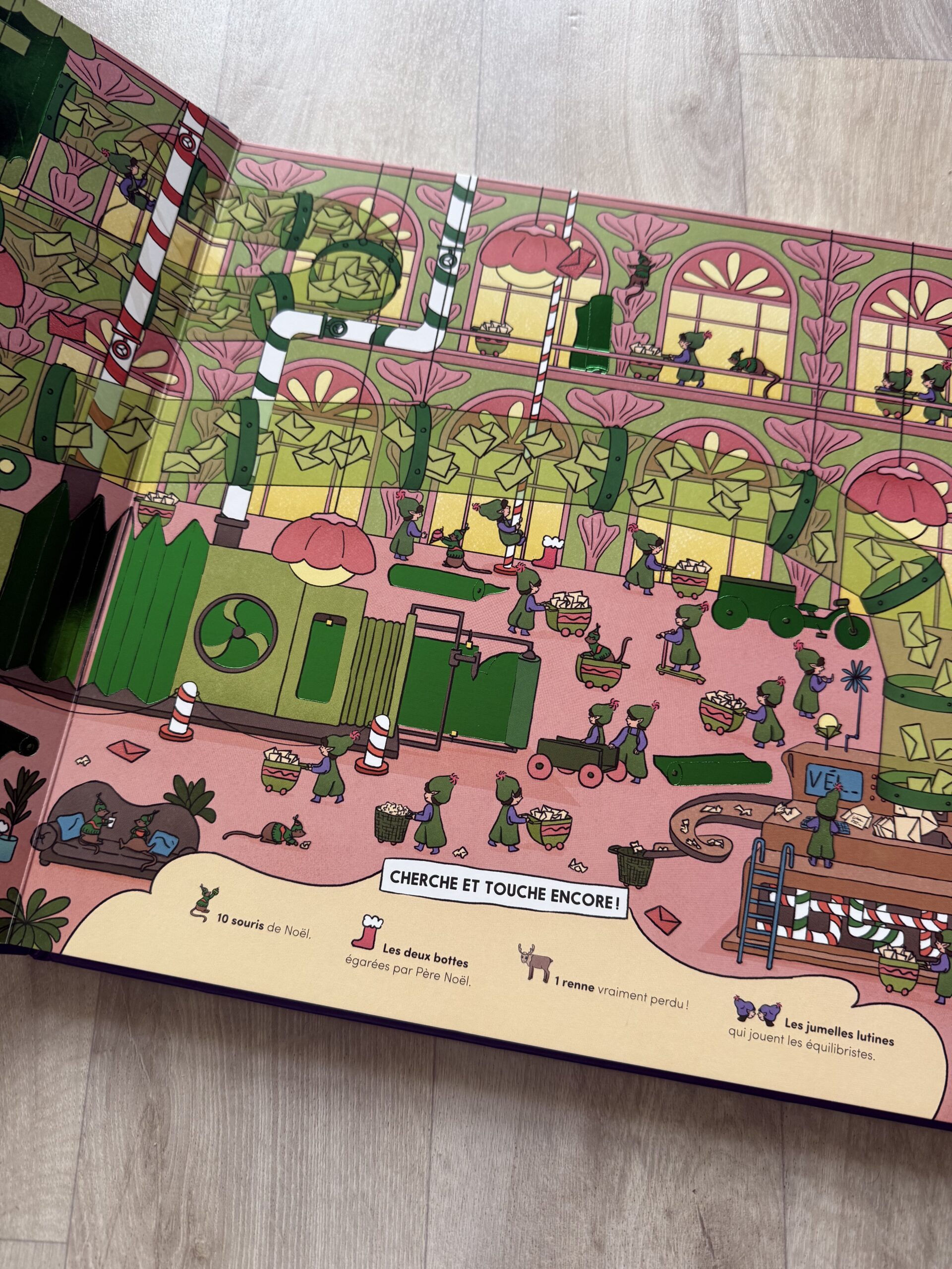 Présentation de ce livre : Avant le grand départ pour la distribution des cadeaux, Perlimpinpin, le plus malin des lutins, déambule dans l’incroyable village de Noël. Accompagne-le à travers l’atelier du courrier, lors de l’emballage des cadeaux, pour nourrir les rennes… Au fil des pages, les enfants devront repérer et toucher des dizaines d’éléments pour que la nuit de Noël soit la plus magique possible.