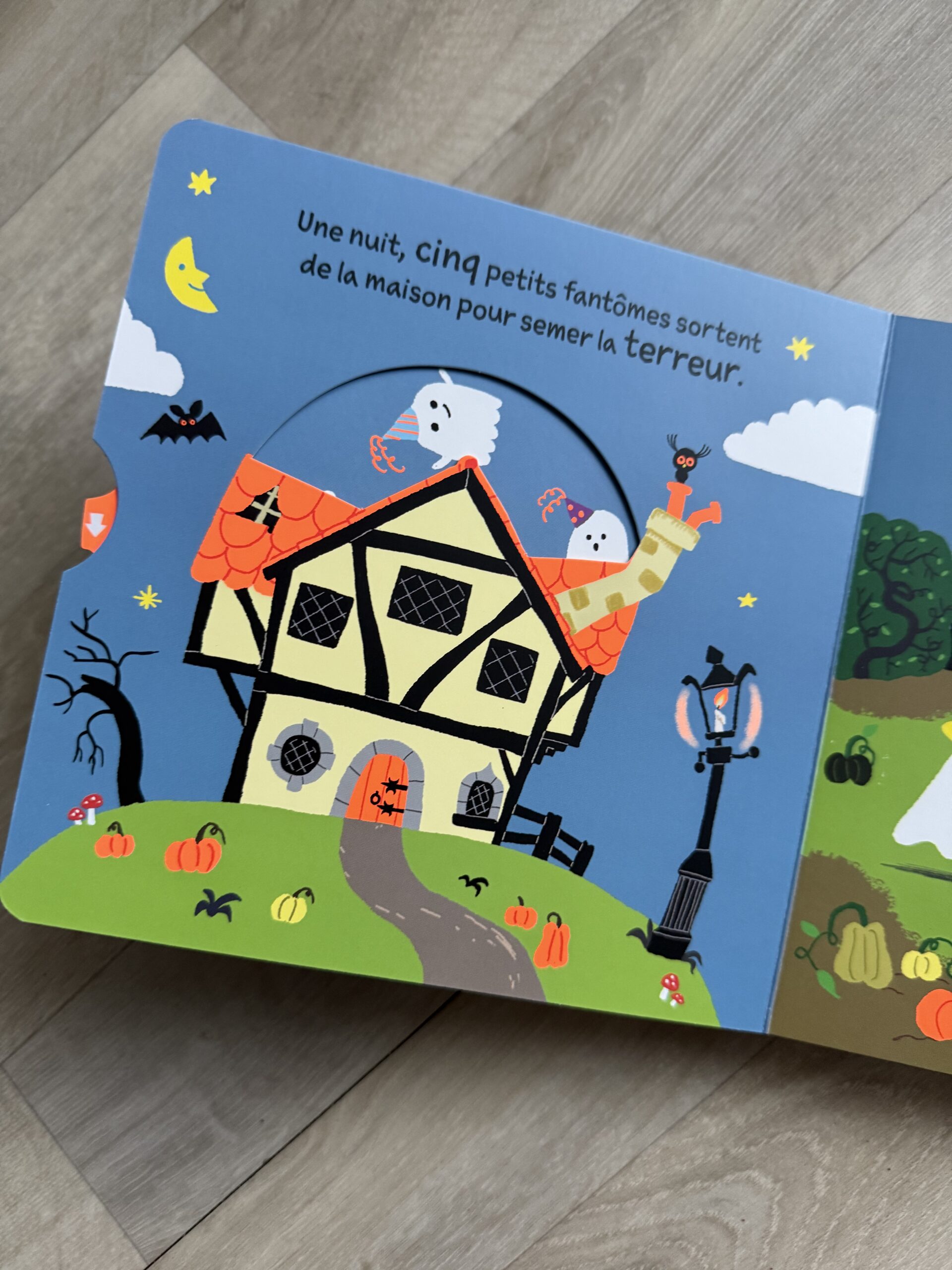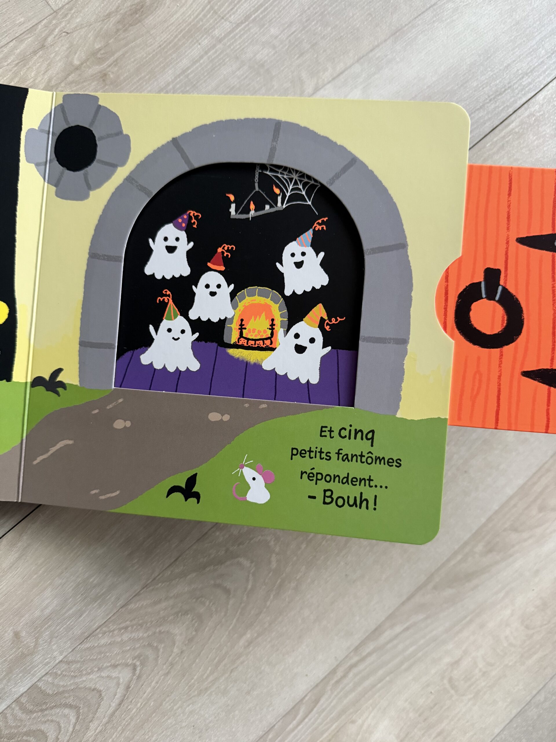 Dans 5 petits fantômes, Maman Fantôme part à la recherche de ses petits esprits farceurs ! Page après page, les enfants s’amusent à soulever les volets et à tirer les languettes pour les retrouver, tout en apprenant à compter jusqu’à cinq. Un livre cartonné plein de surprises, parfait pour les petites mains curieuses.