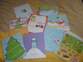 Présentation : Cette boîte contient 20 cartes de voeux pup up à colorier, à envoyer ensuite à sa famille et à ses amis. Il y a deux cartes de chaque dessin, et dix dessins en tout. Les enveloppes sont décorées de jolies étoiles dorées.