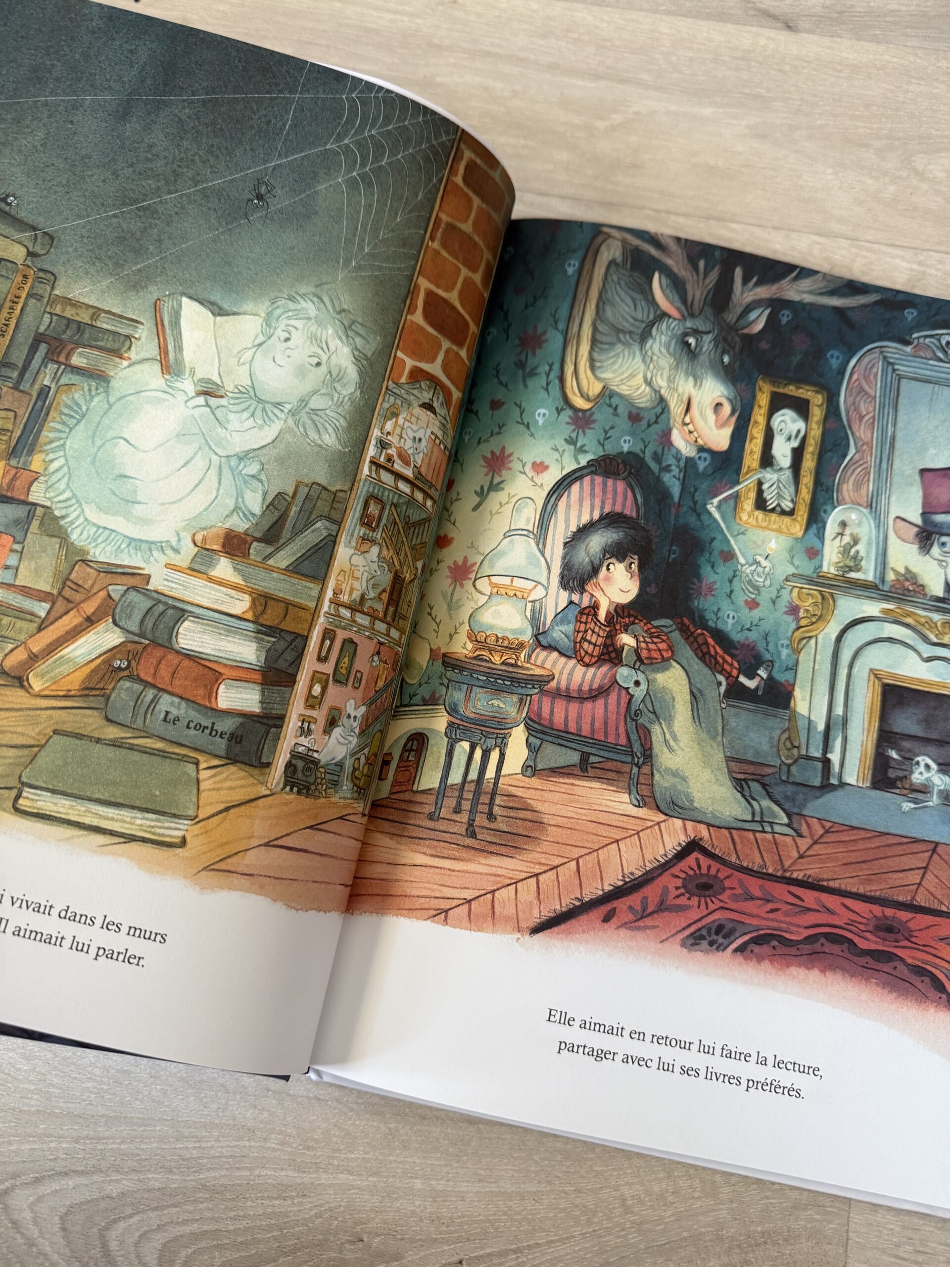 Les illustrations sont superbes : sombres juste ce qu’il faut, lumineuses quand il le faut, avec un vrai sens du détail. On se perd volontiers dans ce manoir rempli de secrets et de douceur et ces dessins réussissent à merveille à nous plonger dans cette ambiance si particulière de cette histoire. Un bel album sensible et envoûtant, idéal pour les soirées où l’on aime se faire un peu peur… mais toujours avec tendresse.