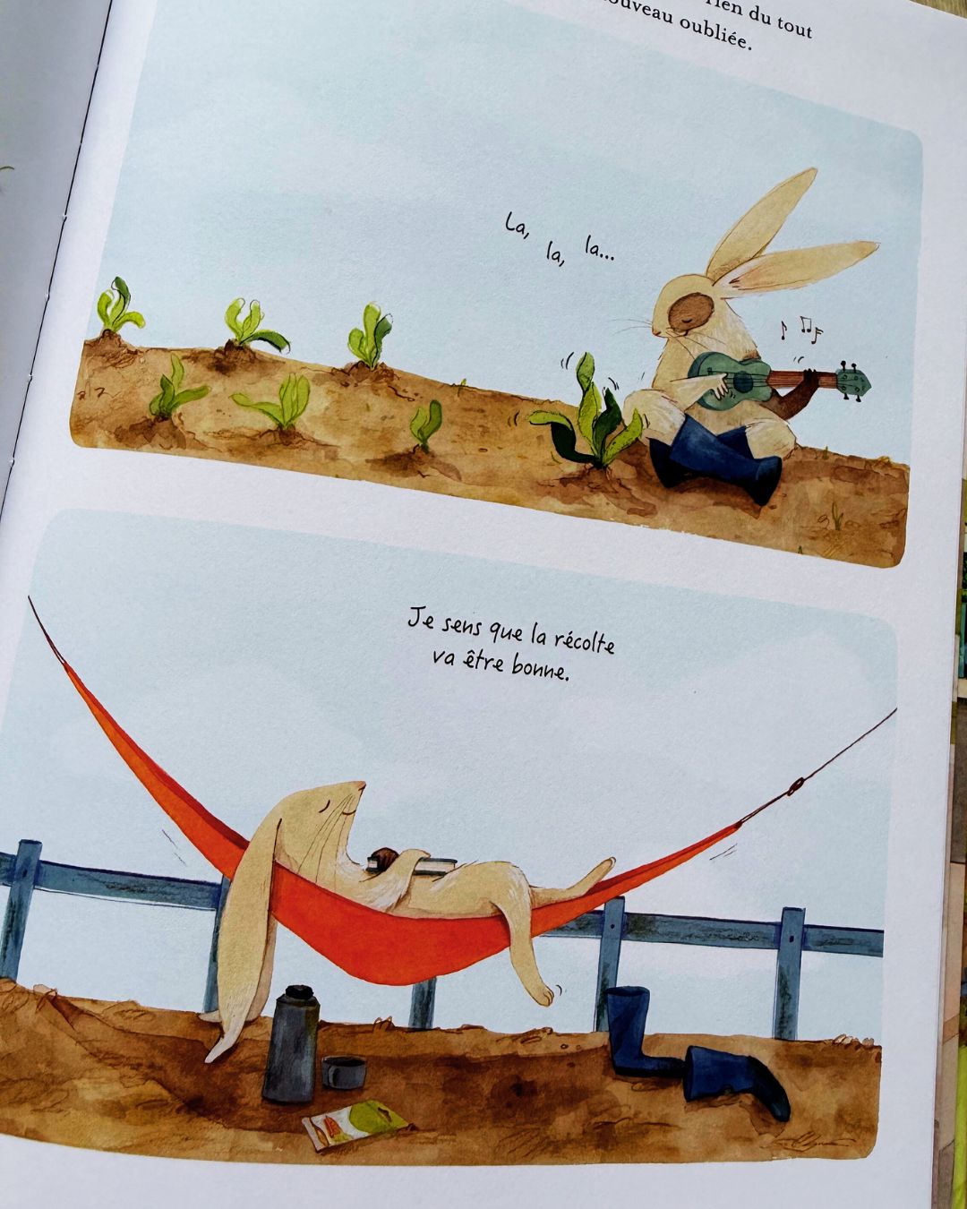 Présentation de cette histoire : Monsieur Lapin vit seul et s’en accommode plutôt bien. Au potager, il bêche, il sème, arrose et surveille. Mais quand arrive le moment de la récolte, il fait une rencontre très spéciale, suivez mon regard… Une carotte qui danse et qui chante, une carotte un poil envahissante ! Comment dire… Monsieur Lapin n’est pas très « fan » de cette carotte, lui qui tient plus que tout à sa solitude. Ah oui ? Vraiment ?