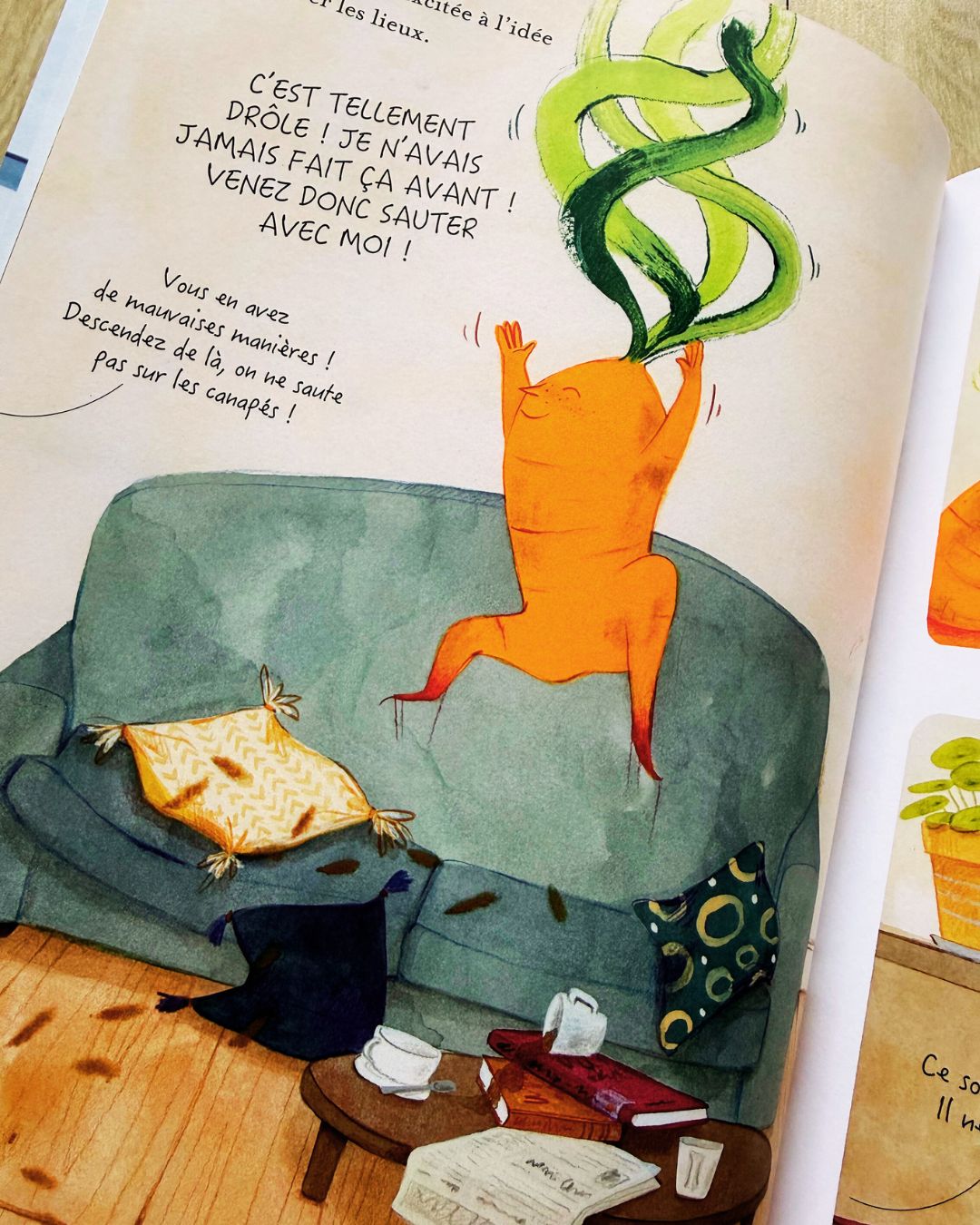 Les illustrations apportent énormément de charme à l’album. Le style est doux, expressif et très vivant. Les personnages sont attachants et leurs expressions transmettent parfaitement leurs émotions : l’agacement de Monsieur Lapin, l’enthousiasme débordant de la carotte… Les couleurs naturelles et les décors du potager créent une ambiance chaleureuse qui plonge le lecteur dans cet univers plein de fantaisie.