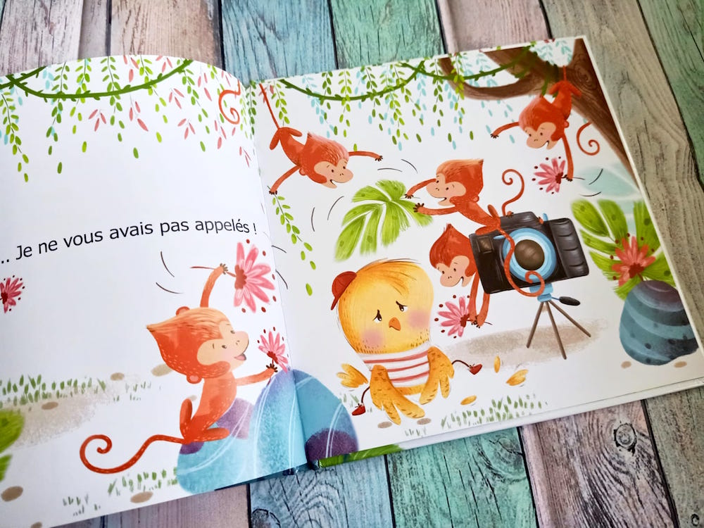 Dans cette histoire pour enfants, nous retrouvons un petit poussin photographe. Ce dernier tente de prendre un cliché. Il essaie de tout mettre en place et tout se termine par la fameuse phrase que l’on connait tous : A trois, on dit ouistiti ! Mais le problème c’est qu’à chaque fois une bande de petits ouistitis apparait à ce moment là ! Le petit photographe n’en peut plus !