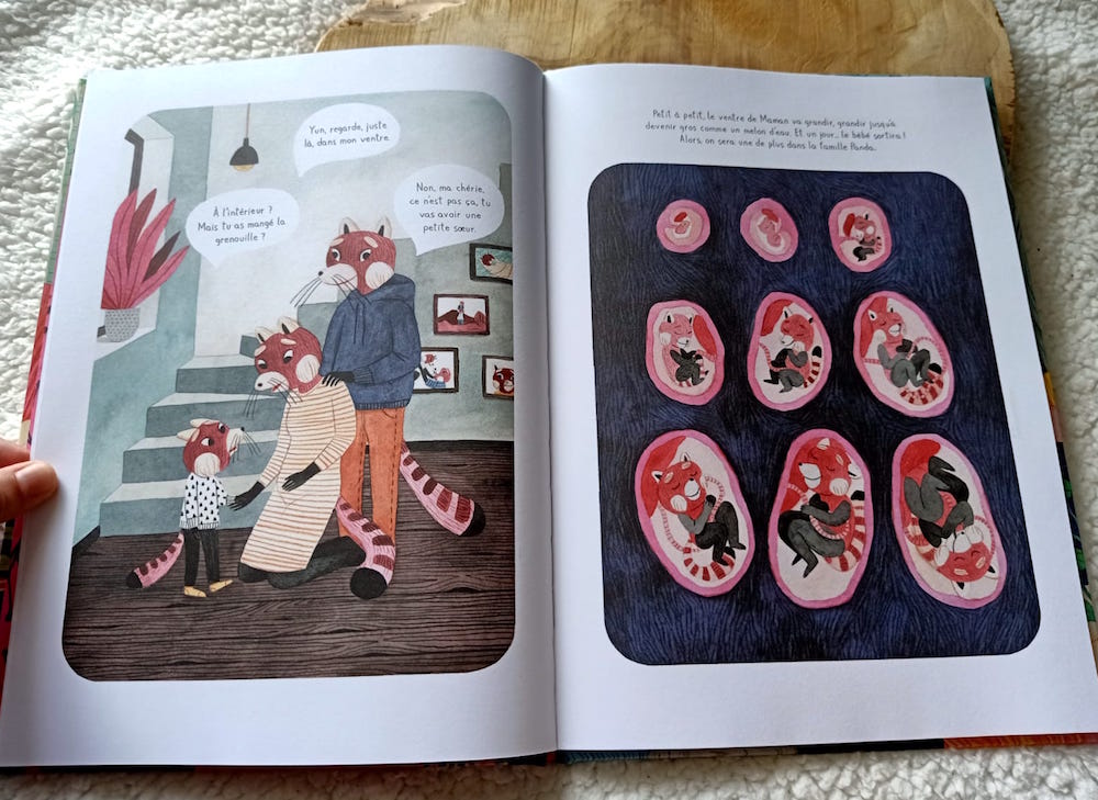 Présentation de cette histoire pour enfants : Que se passe-t-il aujourd’hui ? Papa et Maman Panda sont tout bizarres : le premier a préparé des crêpes et la deuxième a dit avec un petit sourire qu’ils seront bientôt « un de plus ». Un quoi de plus ? Un animal de compagnie ? Un éléphant ? Yun cherche partout dans la maison, mais pas moyen de le trouver. Est-ce que ce serait dans son ventre arrondi que Maman cache ce petit plus ? Pas facile pour Yun d’accepter que sa vie va basculer et qu’elle va devoir désormais partager sa chambre et ses parents : mais avec un peu de patience et beaucoup d’amour, on apprend à être grande sœur, et on y prend vite goût !