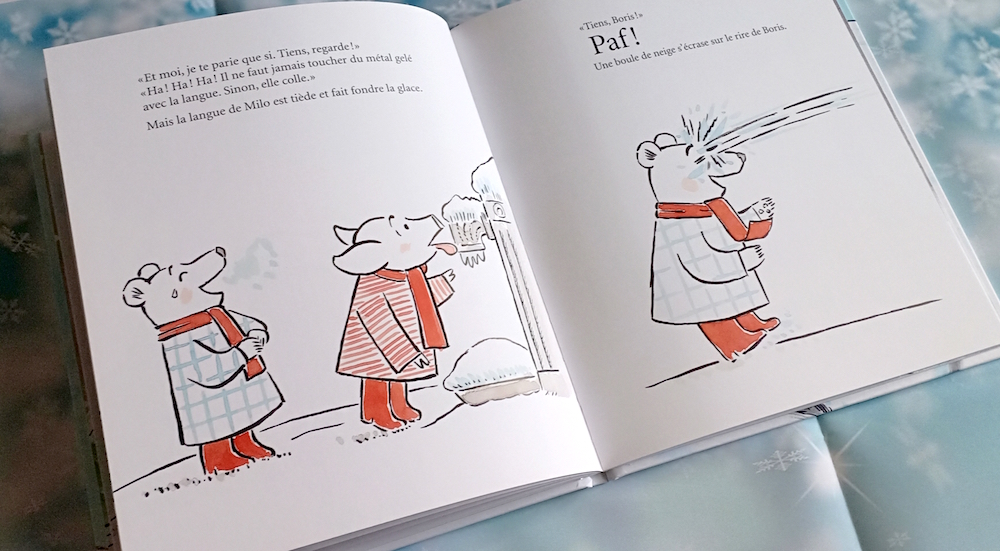 Présentation de cette histoire pour enfants : En une seule nuit et en catimini, la neige a tout blanchi en abondance. Alors, Milo et son ami Boris vont tout faire pour bien profiter de ce cadeau de l’hiver.