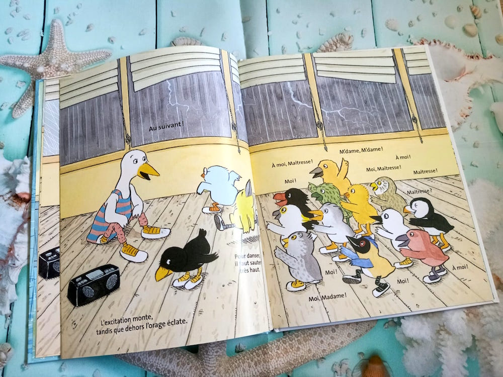 Dans cette histoire pour enfants, nous retrouvons une classe qui s’apprêtent à faire un petit cours de danse en intérieur, puisque dehors l’orage gronde. Etirements, échauffements, … puis chacun son tour montre ce qu’il sait faire en danse. C’est Piou-Piou, qui très fière, commence. Mais personne ne semble convaincu. Pire il se moque d’elle, ce qui ne va pas plaire à Piou-Piou qui va se sauver sans que personne ne la voit. Mais Piou-Piou est-elle bien passée ?