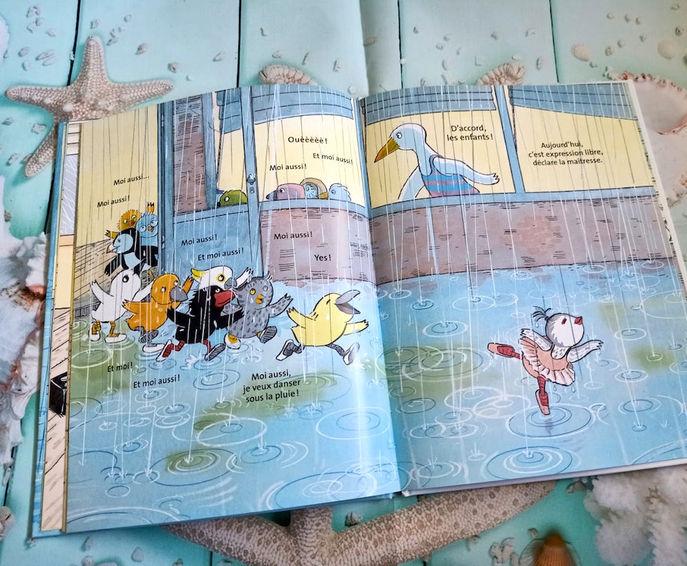 Cette histoire pour enfants est relativement simple et amusante. On y retrouve ici des thèmes bien connus dans les cours d’école puisqu’ici la moquerie est de rigueur. Bon, ce n’est pas non plus, le point principal sur lequel s’attarde cet album, mais tout part de là. On évoque bien évidemment la danse, propre à chacun avec des gestes parfois rigolos. Mais surtout, cet album met en valeur l’expression « Apprendre à danser sous la pluie ». En effet, Piou-Piou n’attend pas que l’orage passe, elle danse sous la pluie. Une jolie image mis en valeur dans ce texte que les jeunes enfants pourront apprendre et mettre en place également dans leur vie.