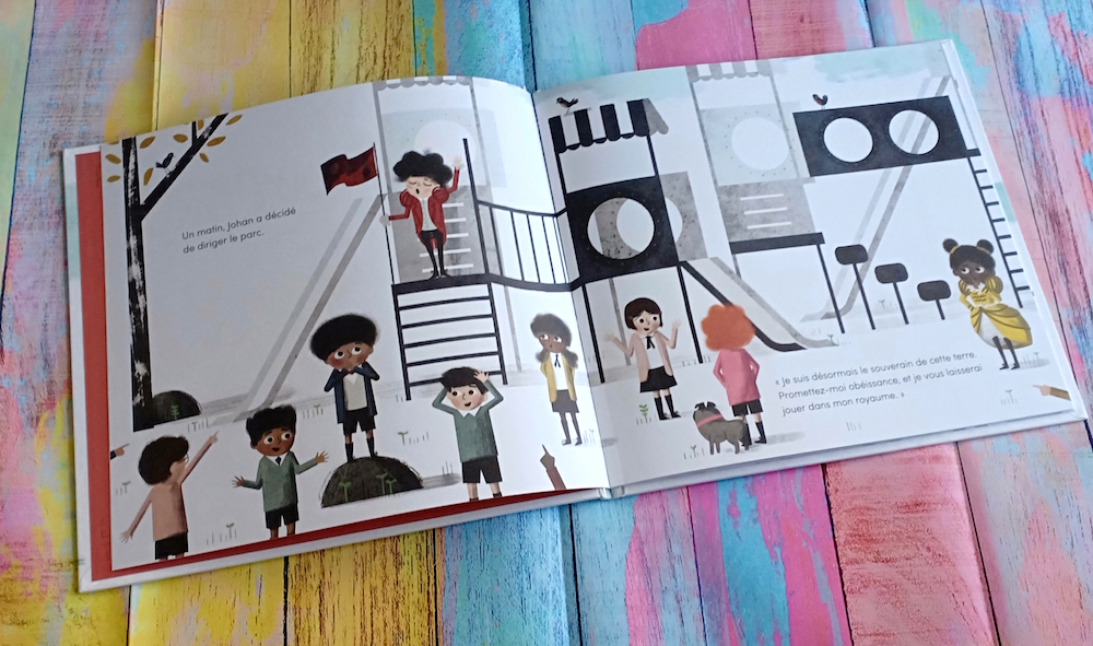 – A la maison, nous avons beaucoup aimé l’originalité de cette histoire pour enfants. On y retrouve une bande de gamins qui jouent au parc et où deux clans se sont formés. Il y a le roi Johan et la reine Léanne qui tout deux règnent sur le parc et chacun tente d’étendre son royaume.