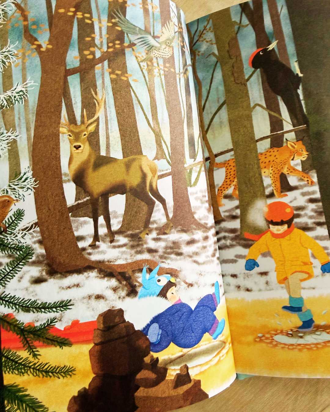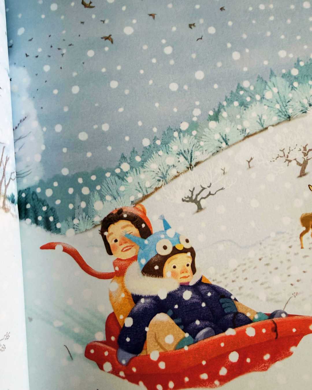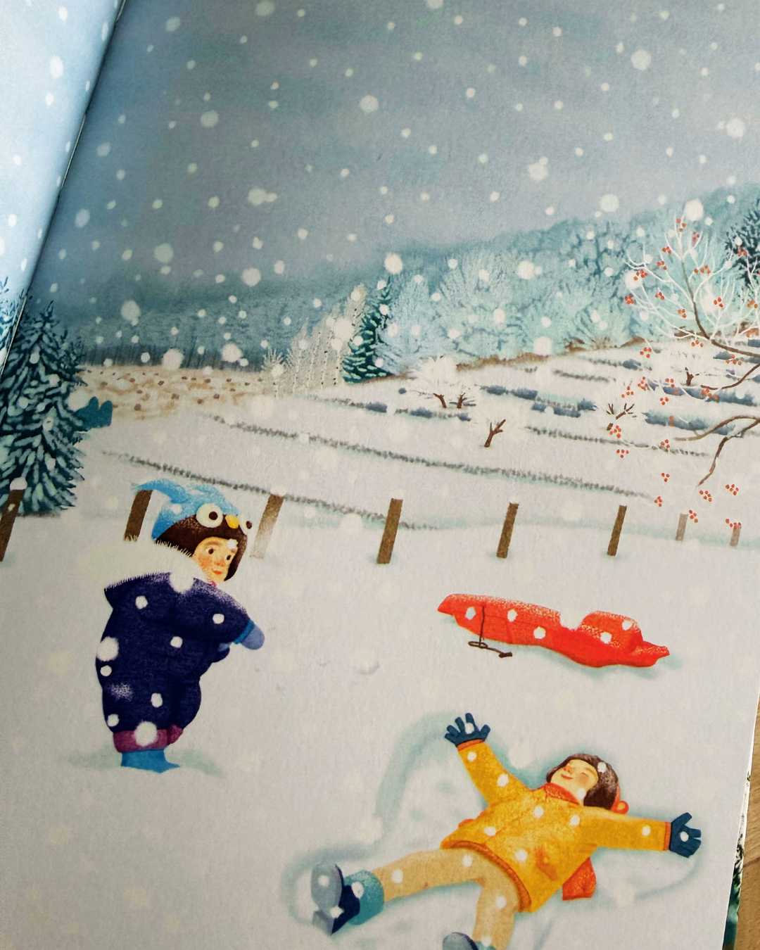 Les illustrations ont été, elles aussi, un véritable coup de cœur. Douces et délicates, elles prolongent parfaitement la poésie du texte. Les couleurs feutrées, les scènes hivernales pleines de calme et de silence créent une atmosphère enveloppante, presque réconfortante. Chaque image invite à la contemplation et accompagne le lecteur avec beaucoup de sensibilité. Elles participent pleinement à cette sensation de lenteur et de douceur qui fait tout le charme de l’album.