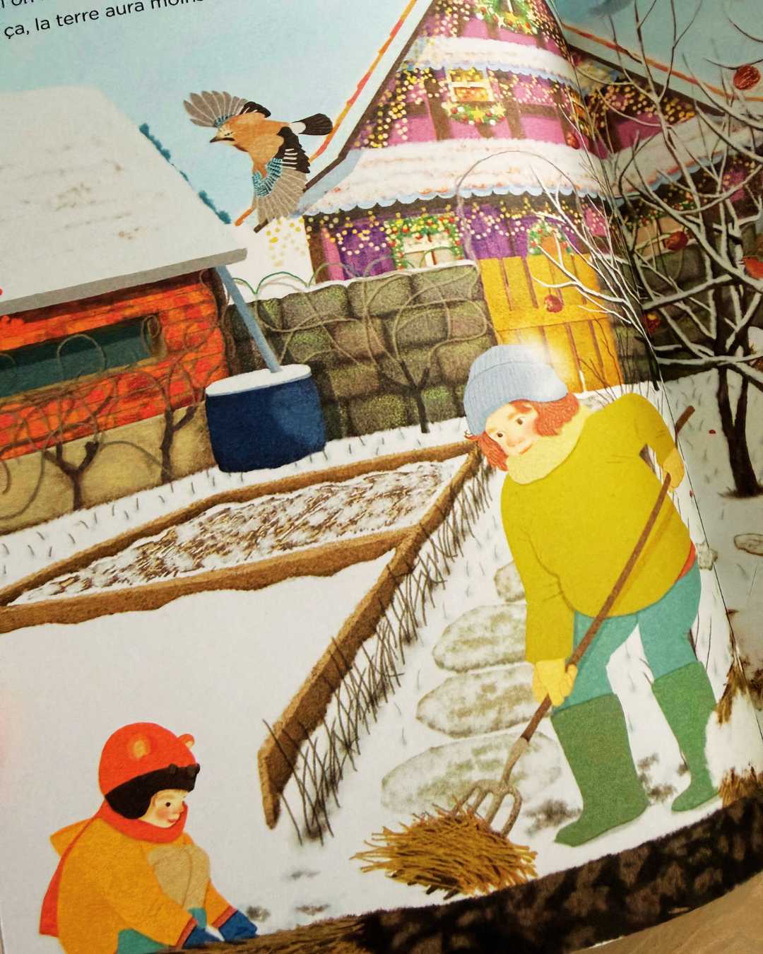 🌨️ Observer la couverture ensemble et parler de l’hiver : le froid, la neige, le silence.