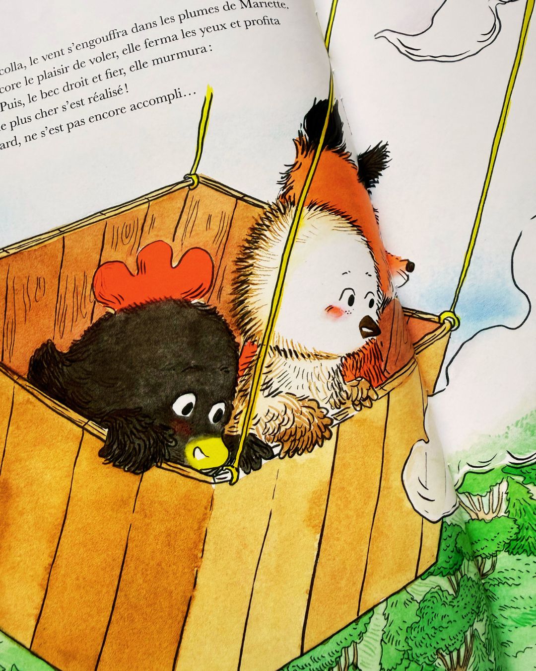 Les illustrations sont absolument charmantes. Douces, expressives et pleines de tendresse, elles donnent vie à Mariette avec beaucoup de finesse. On ressent parfaitement ses émotions à travers les détails de son regard et de sa posture. L’univers graphique est à la fois léger et chaleureux, avec des couleurs apaisantes qui accompagnent parfaitement le récit. Les scènes sont dynamiques, presque aériennes, et renforcent ce sentiment d’élan et de rêve qui traverse toute l’histoire.