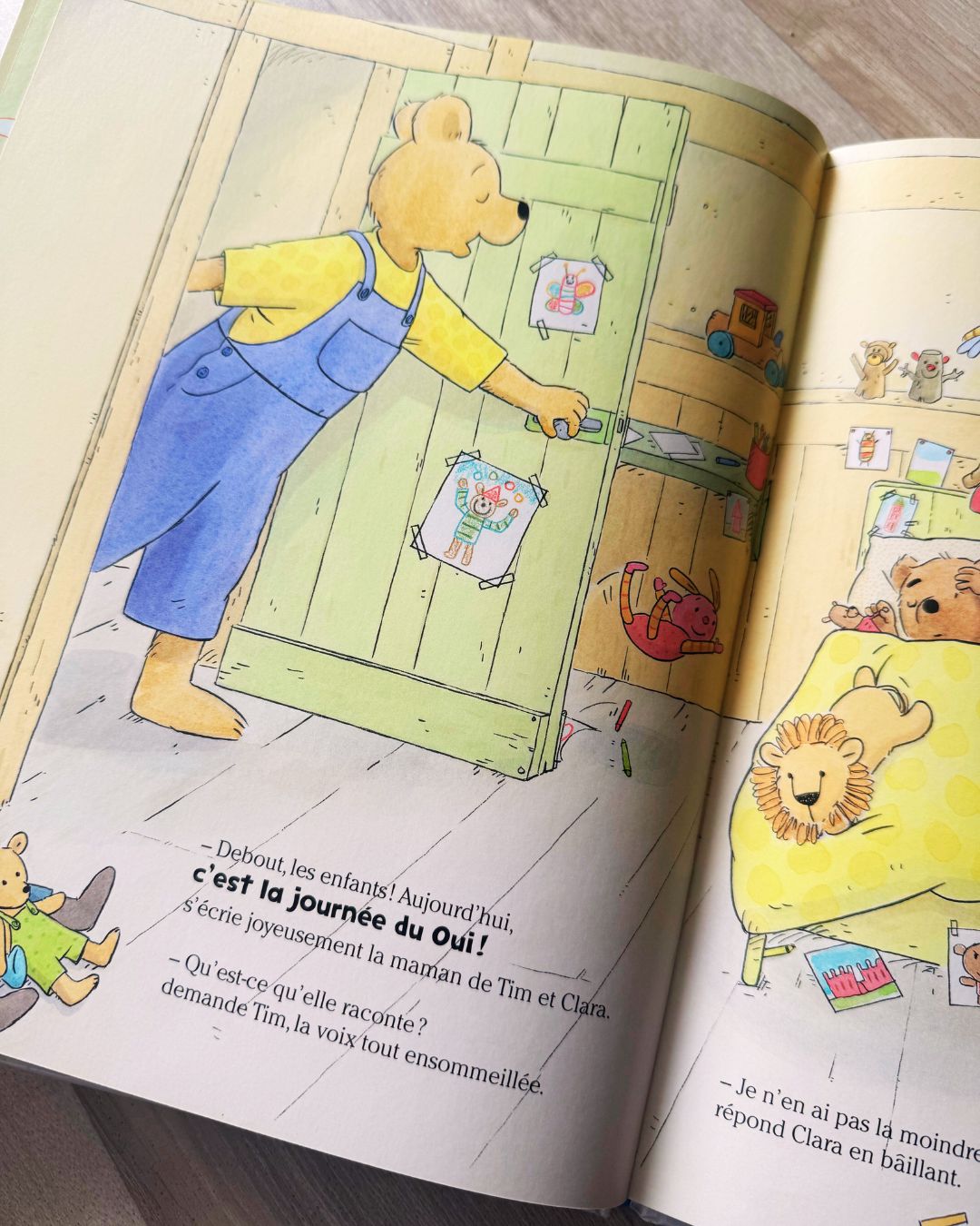 Présentation de cette histoire : Aujourd’hui, c’est la journée du Oui! Quoi que demandent Tim et Clara, leur maman leur dira oui. Mettre des bonbons sur leur déjeuner, faire du patin dans la salle de bain et sauter sur les lits, les enfants ne manquent pas d’idées. Mais ils risquent surtout de comprendre que lorsque Maman dit non, c’est bien pour une raison !