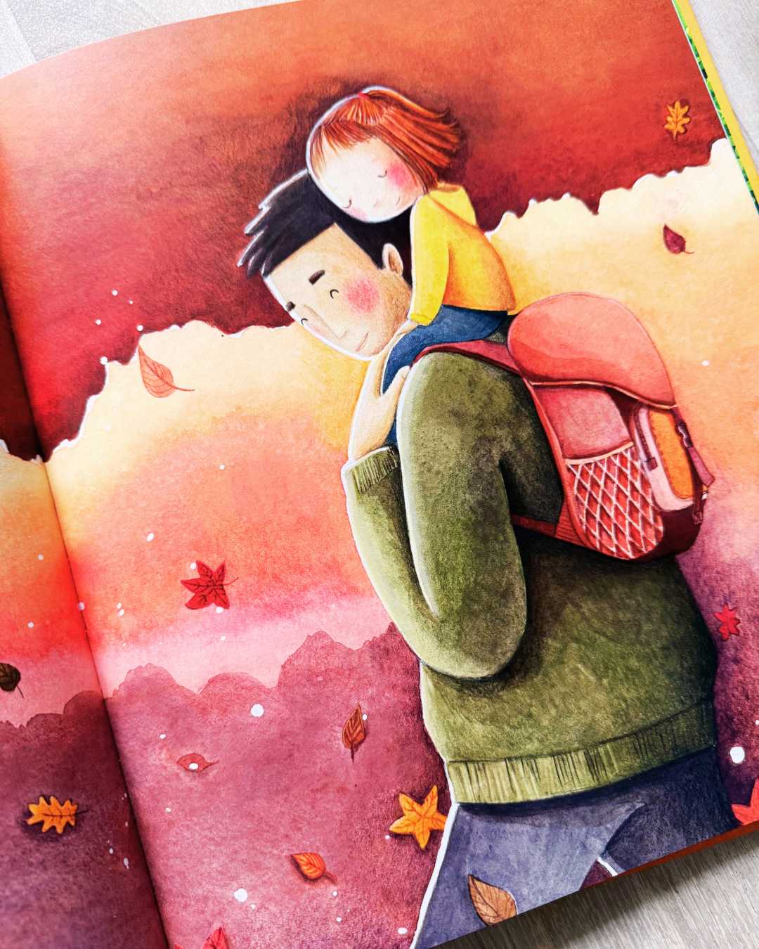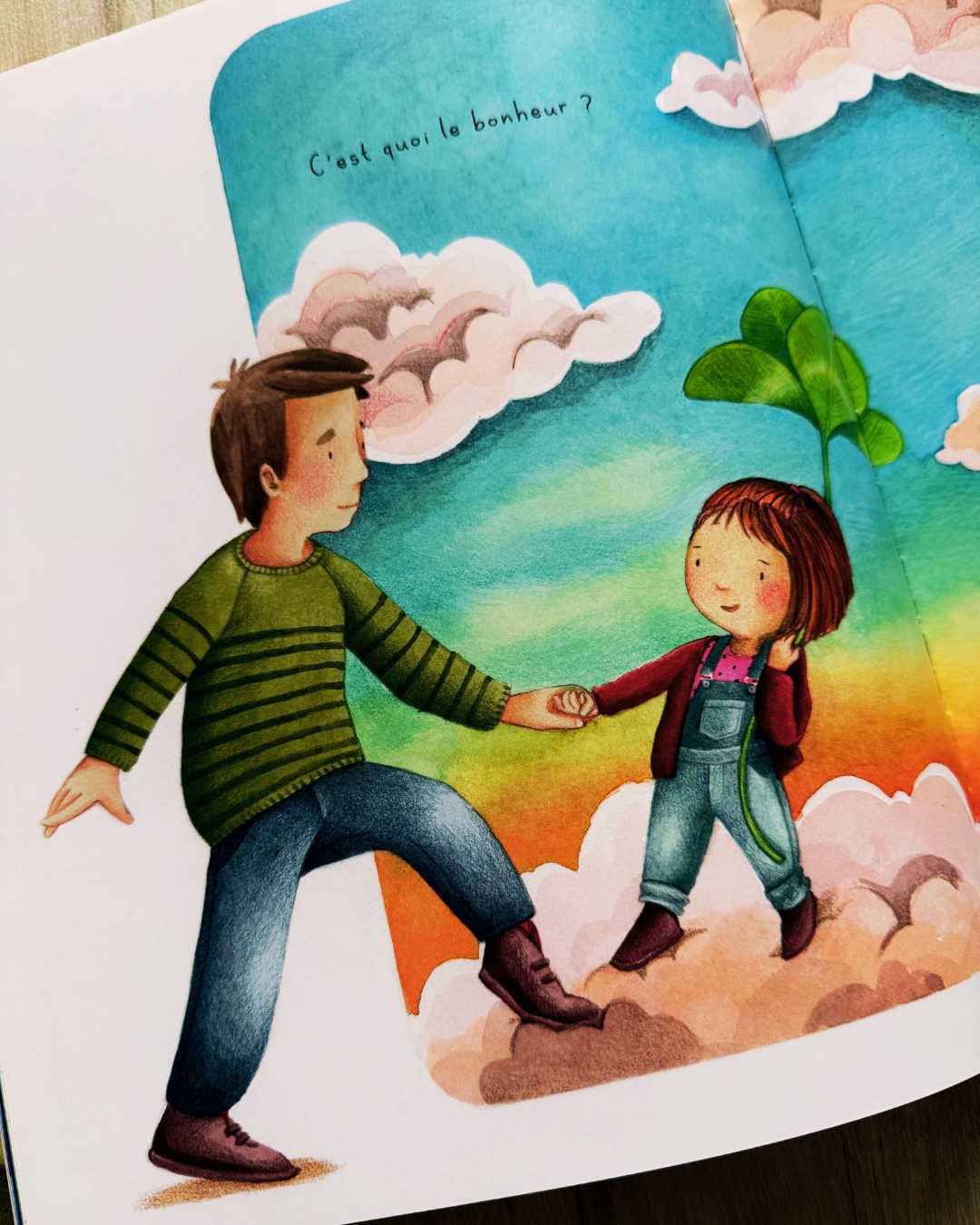 Les illustrations de Maud Roegiers sont un véritable point fort de l’album. Douces, chaleureuses et pleines de poésie, elles accompagnent parfaitement le texte sans jamais l’alourdir. Les personnages semblent flotter dans un univers à la fois onirique et rassurant, où les couleurs chaudes et les petits détails invitent à l’observation. Les images laissent de la place à l’imaginaire et renforcent cette impression de calme et de bienveillance qui se dégage du livre. Je suis vraiment fan du travail de cette illustratrice !