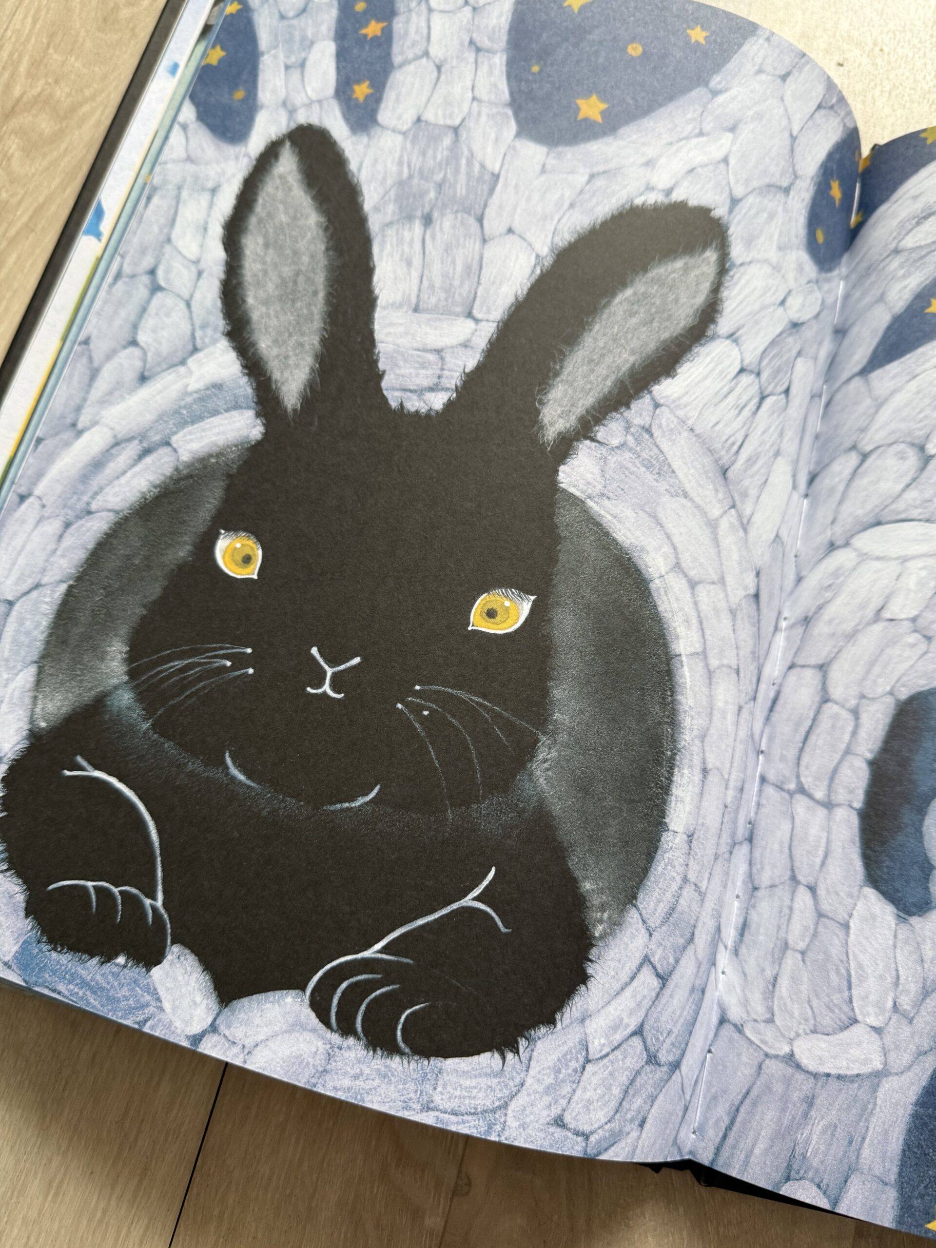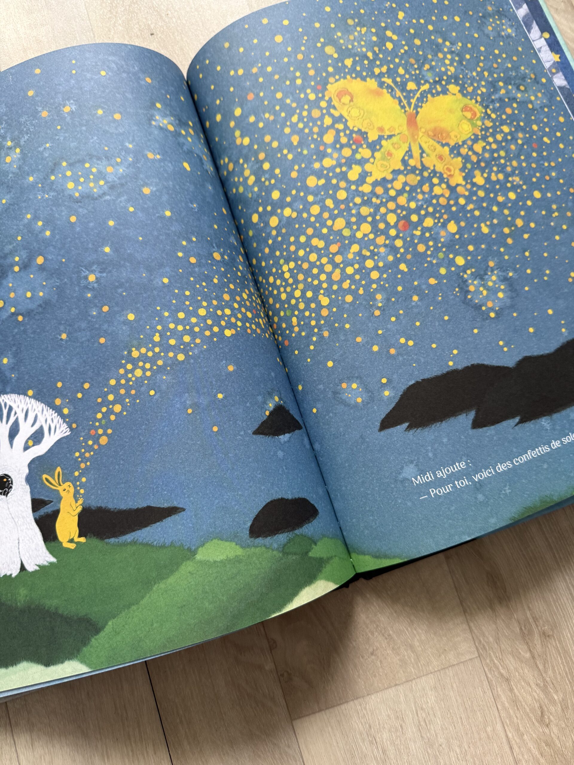 J’ai été très touchée par la délicatesse et la douceur de cet album. On ressent une ambiance particulière, calme et un peu mystérieuse. J’ai beaucoup aimé l’idée de ces cinq lapins, chacun associé à un moment de la journée, et la façon dont Minuit reçoit ses cadeaux… avant de trouver, à son tour, comment offrir quelque chose de lui-même à ses frères et sœurs. Il y a une vraie dimension symbolique, mais elle reste accessible pour les enfants : on parle de tristesse, de solitude, de générosité et de tendresse avec infiniment de pudeur. C’est un album qui fait du bien, qui rassure et qui ouvre joliment la porte aux discussions sur les émotions.