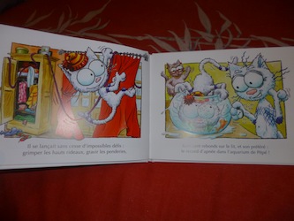 Le texte est plein d’humour et de jeux de mots en tout genre, et surtout avec les noms des chats. Et puis il y a des rimes qui donne un certain rythme au texte. Bref quand on lit ça glisse sur la langue ! 😉