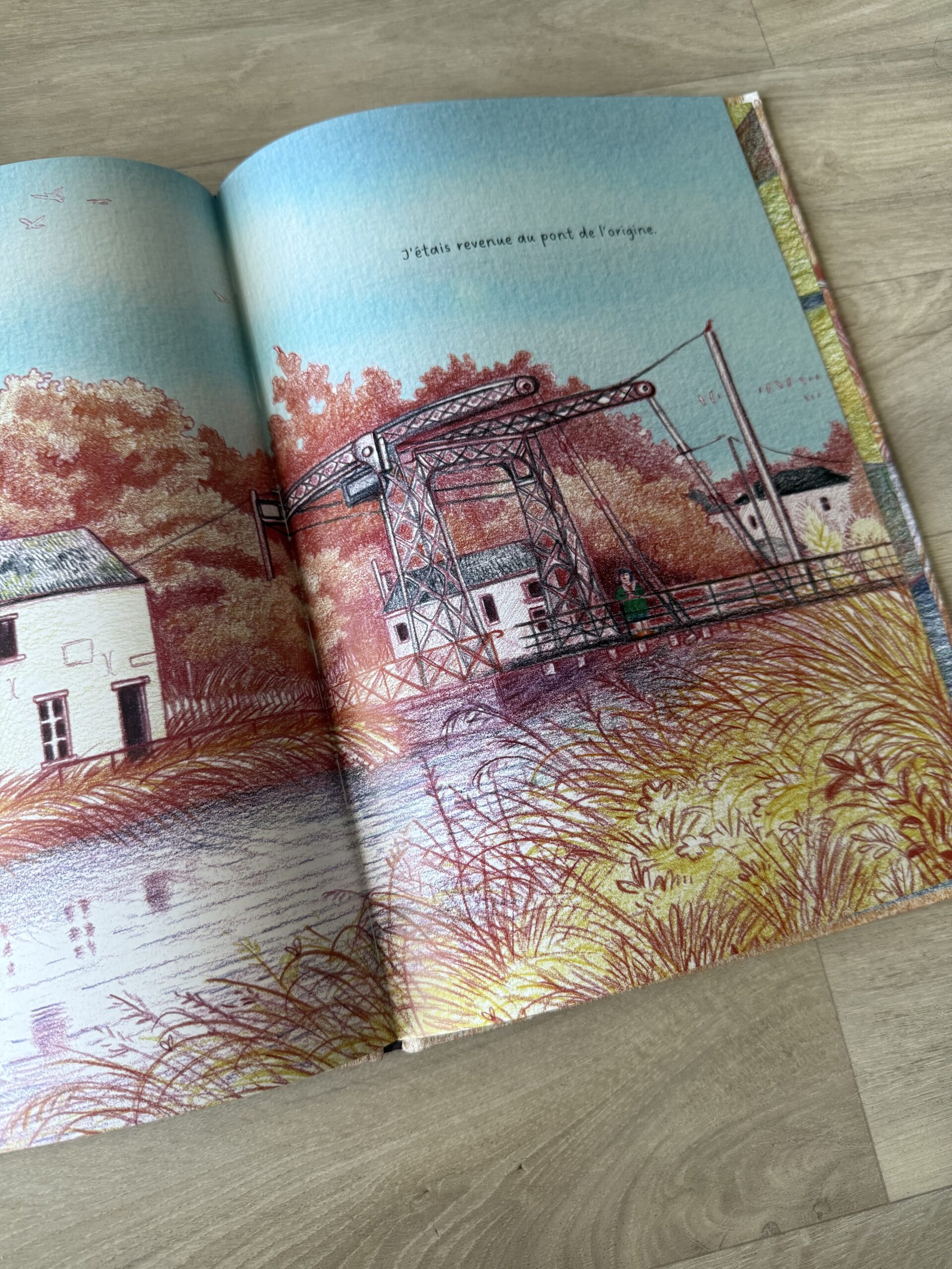 Les illustrations sont très jolies, douces, aérées, avec beaucoup de silences visuels et des tons apaisants. Elles traduisent à merveille l’émotion du texte et donnent envie de s’y promener lentement, comme la fillette le long de son canal. En refermant ce livre, on garde en soi une impression de calme, de nostalgie et de tendresse. Le pont de l’origine est un album poétique et sensible, à lire quand on a envie d’un peu de douceur et d’introspection.
