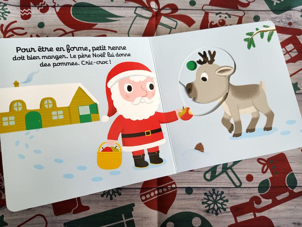 Si vous connaissez la collection Kididoc, alors vous voyez comment est fait ce livre. Il est simple et efficace avec une petite histoire courte et sympathique sur le thème de Noël avec des tirettes à actionner sur chaque page ainsi que des puces sonores à découvrir. C’est donc un livre très complet qui va attirer les plus petits.