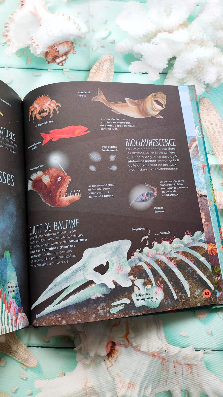 Ce livre confirme le joli succès des deux précédents volets. C’est un livre aussi beau que passionnant. Ici, nous partons à la découverte des océans de notre planète. Il se découpe cinq grandes parties : Qu’est-ce qu’un océan ?, Animaux océaniques, Vivre dans l’océan, Habitats océaniques et L’océan et moi. Je trouve ce programme très complet et vraiment très très intéressant.