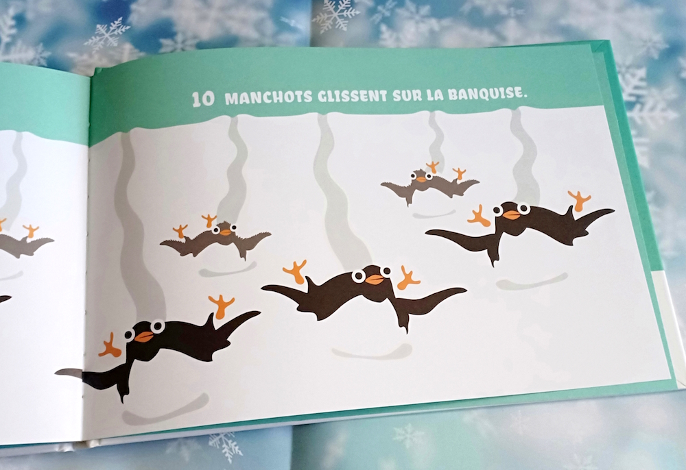 – Ce livre pour enfants est relativement simple, et on retrouve, ici, très peu de textes. Il y a seulement une petite phrase sur chaque page. Du coup, si vos enfants aiment les vraies histoires, alors, ce ne sera peut-être pas un titre à leur proposer. En revanche, ici, les enfants pourront affiner leur sens de l’observation et découvrir les nombres en comptant les manchots qu’ils verront sur la banquise.