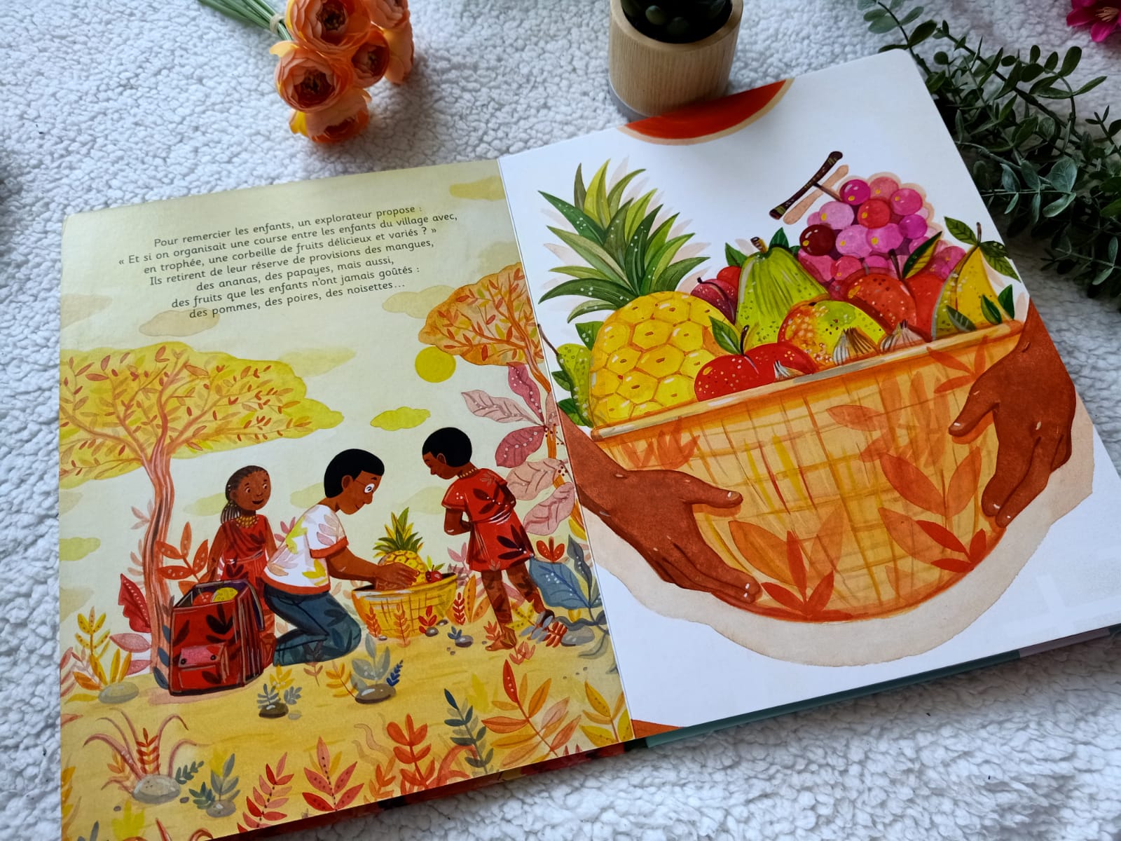 Dans cette histoire pour enfants, nous nous retrouvons au coeur de l’Afrique avec une équipe qui part à la rencontre des enfants d’un petit village. Ils sont très bien accueillis et les habitants n’hésitent pas à partager leur maigre repas avec eux. Un jour, ils organisent une petite course et le vainqueur remportera une grosse corbeille de fruits. Notre équipe est loin d’imaginer ce qui va se passer.