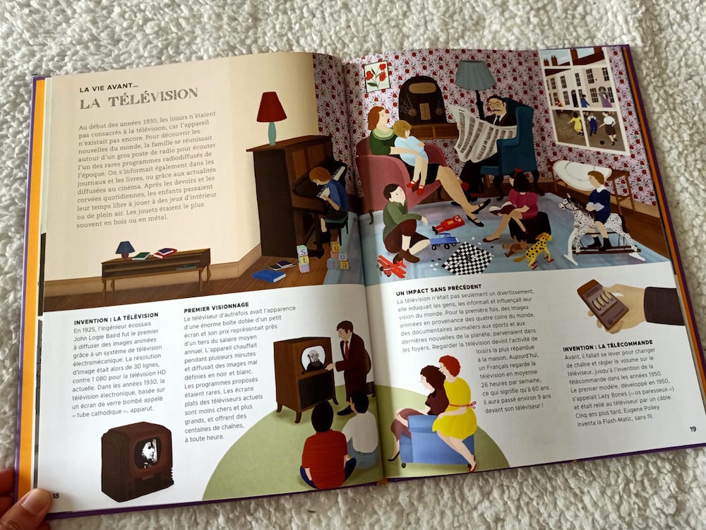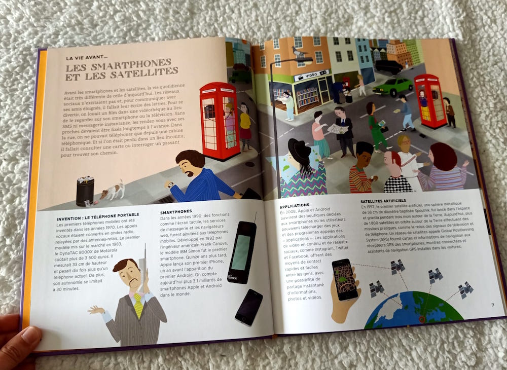 Chaque page propose de découvrir la vie avant une chose en particulier. Cela peut être le télégraphe et le téléphone, les ordinateurs domestiques, le profil génétique, l’agriculture, les engins de construction, internet, … On touche vraiment à tous les domaines, et on y parle aussi bien des inventions récentes que celles beaucoup plus anciennes, mais toujours présentes dans nos vies. C’est vraiment passionnant !