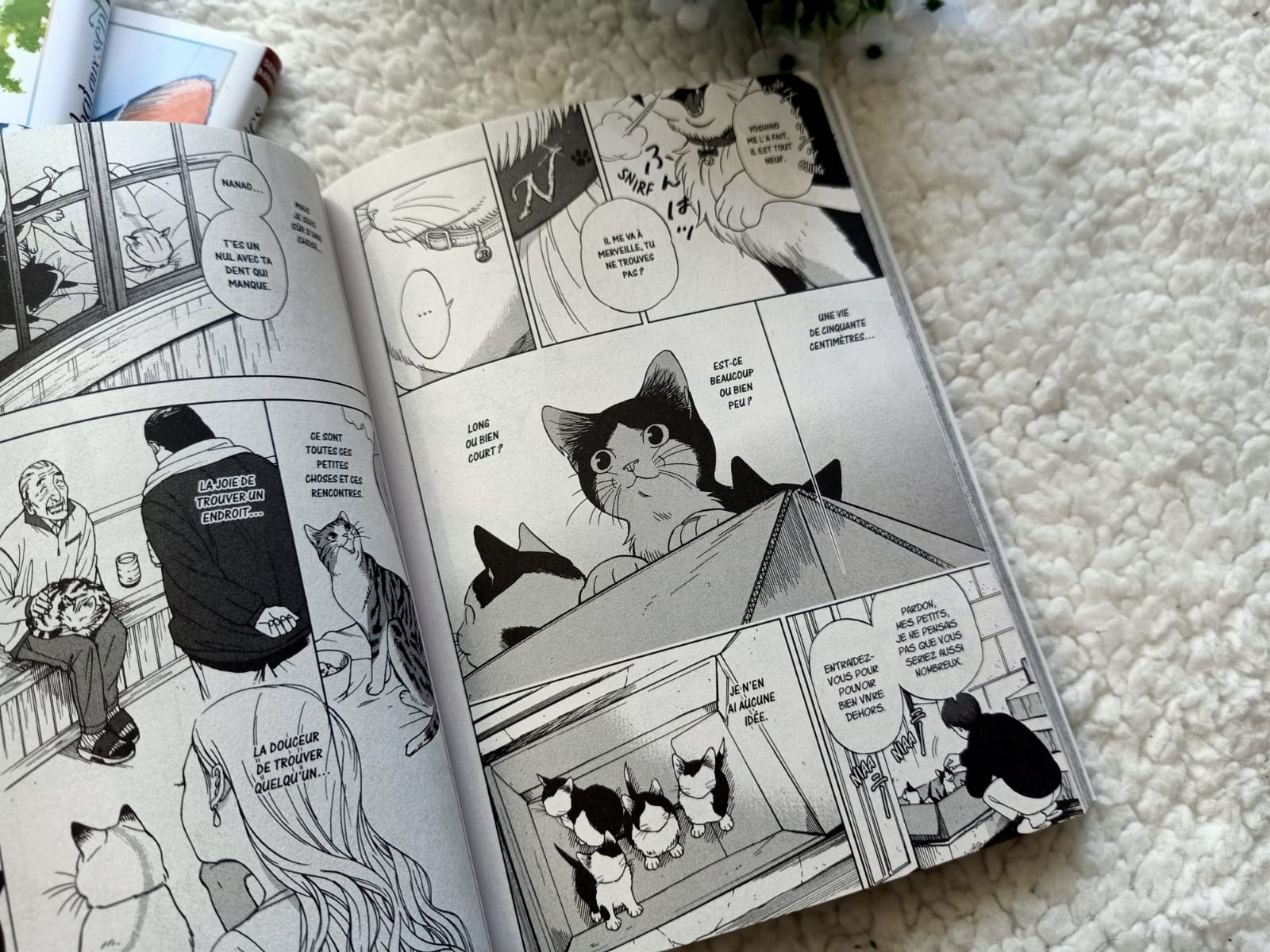 Que vous dire de cette histoire si ce n’est qu’elle est on ne peut plus touchante. Il est certain que vous allez craquer pour l’histoire de Nanao ce petit chat si attachant, ainsi que de ses amis de la rue. J’ai adoré ce manga qui sait habillement mêler les sentiments et les émotions et faire de ce récit une histoire poignante que l’on n’oubliera pas de si tôt. Outre cette histoire qui lit nos deux personnages, il y a aussi la dure réalité que les chats des rues vivent. Leur quotidien est semé d’embuches et la mort est toujours omniprésente.