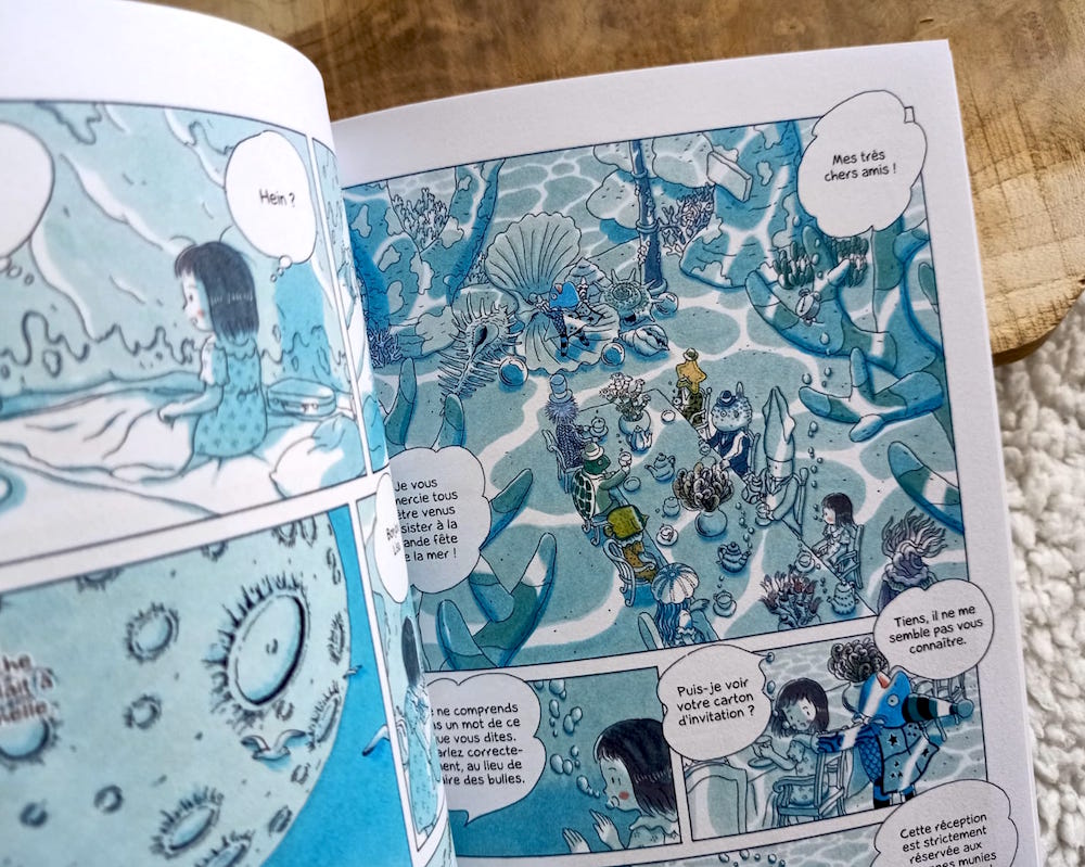 J’ai beaucoup aimé les illustrations qui sont très douces et très jolies, à l’image des textes. C’est un univers très bien représenté et la nature y tient une place centrale, et la mer en particulier. Tout est dans les tons blancs et bleus, dégageant ainsi une certaine pureté.