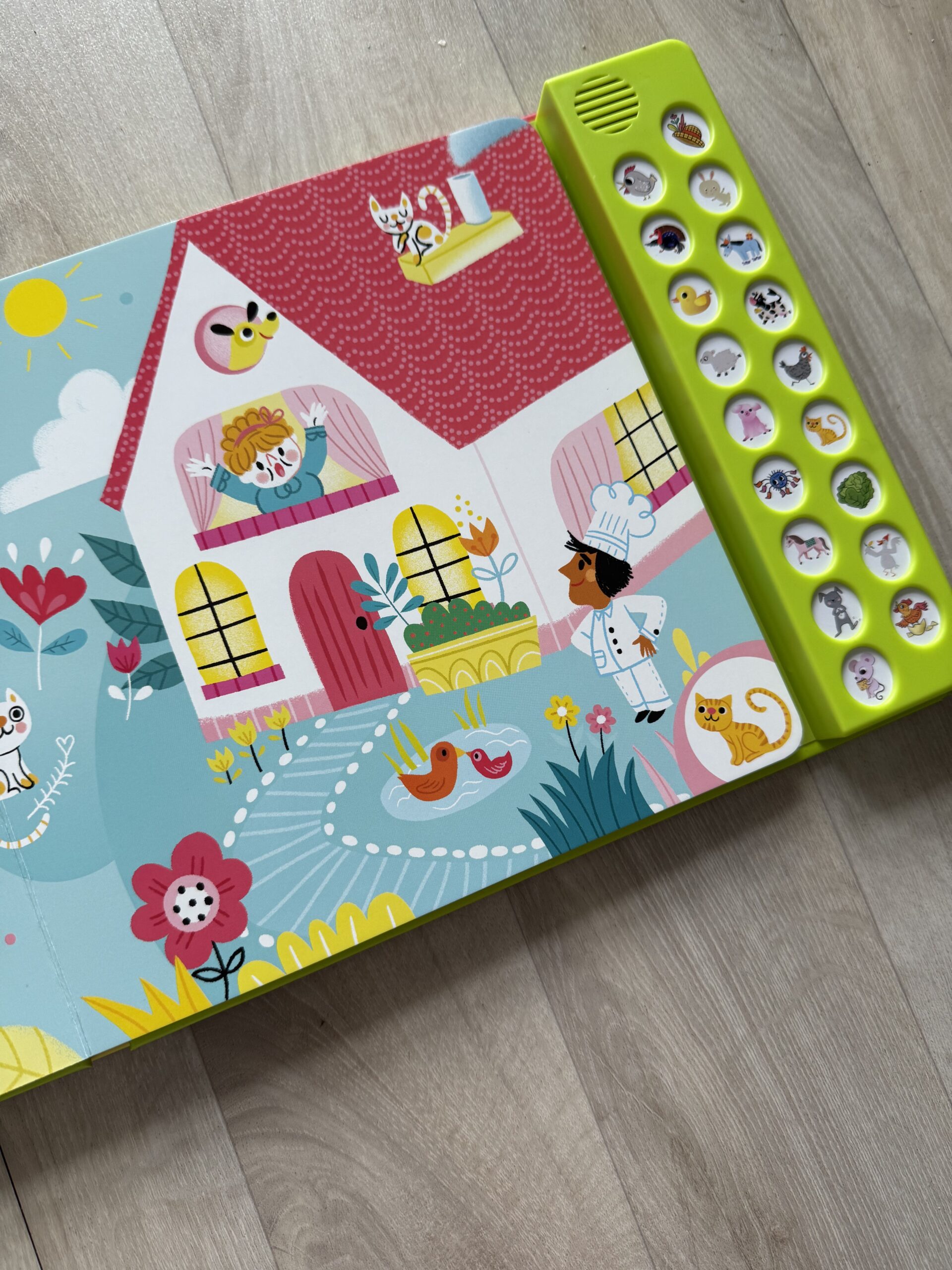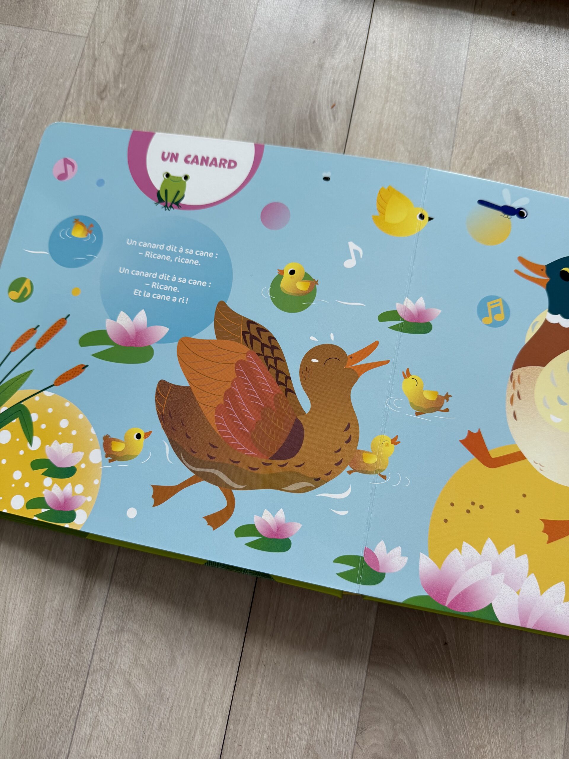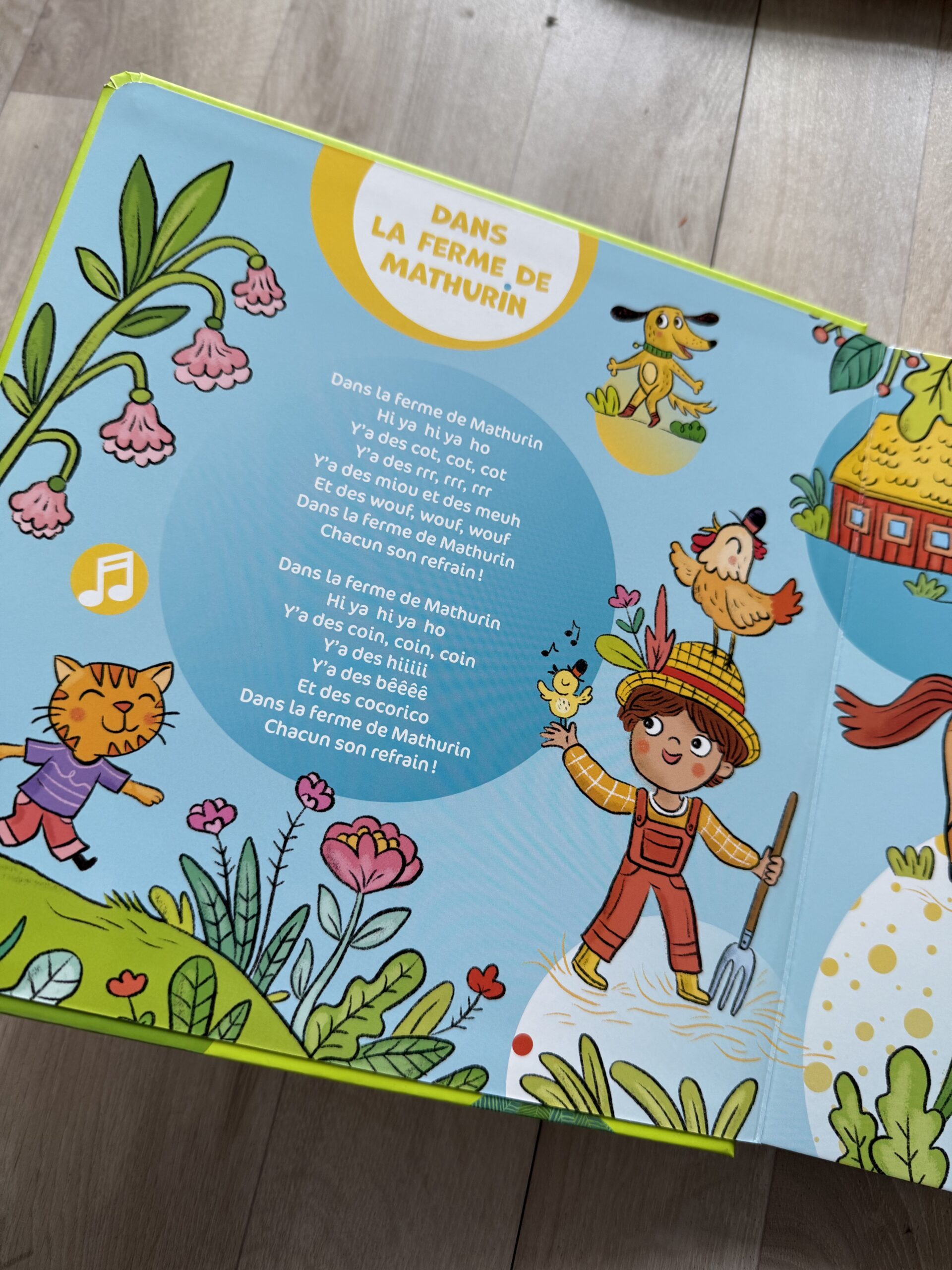 Les illustrations sont douces, colorées et pleines de tendresse. Les animaux ont des bouilles adorables et les scènes de ferme respirent la bonne humeur. Le tout forme un univers joyeux, accessible et très attrayant pour les tout-petits. Pour nous, c’est un livre sonore incontournable pour les premières découvertes musicales. Un joli titre à offrir ou à s’offrir, pour chanter, rire et partager de beaux instants d’éveil avec son enfant. Un coup de coeur !