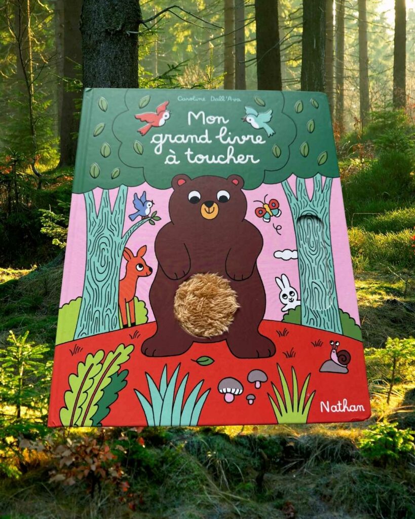Mon grand livre à toucher est un très bel album sensoriel publié par les éditions Nathan. Ce grand format cartonné invite les petits à explorer le monde du bout des doigts. On va découvrir la maison, la forêt, l’océan, la ferme, … Chaque page propose de jolies images à observer et des matières variées à toucher : tout doux, rugueux, lisse… une vraie découverte sensorielle !