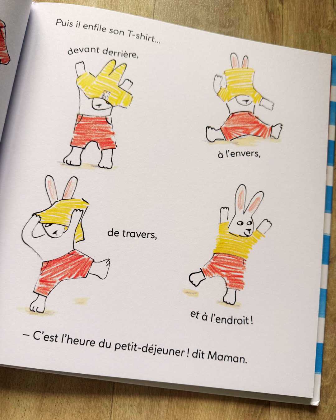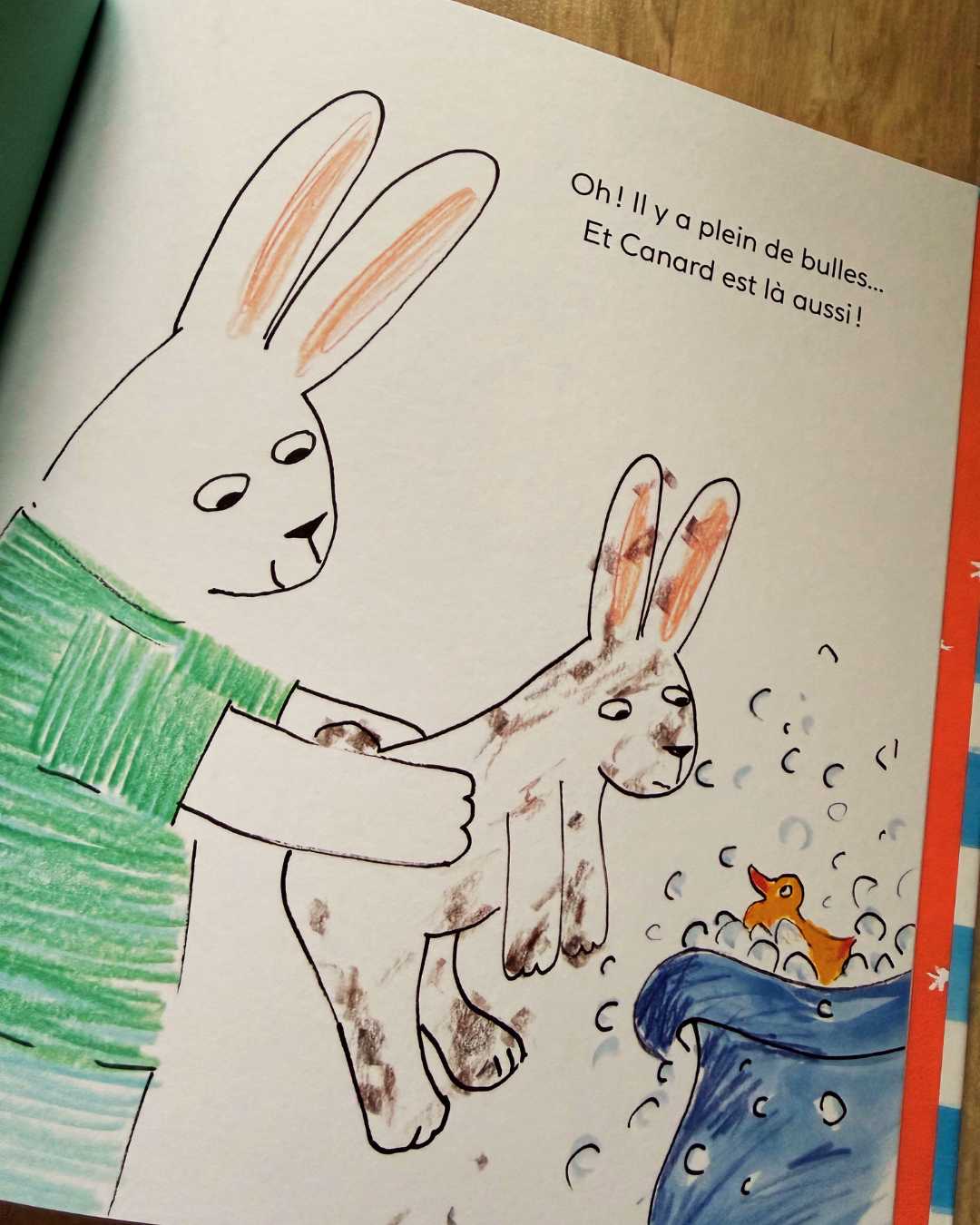 Présentation de cette histoire : Lapin n’a pas envie d’écouter sa maman qui lui dit de se lever, de s’habiller, de prendre son petit-déjeuner, de jouer dehors, de rentrer à l’intérieur et, surtout, Lapin n’a VRAIMENT PAS envie de… prendre un bain. NON, NON, NON ! proteste-t-il. Maman et Lapin trouveront-ils quelque chose qu’ils aiment faire tous les deux ?