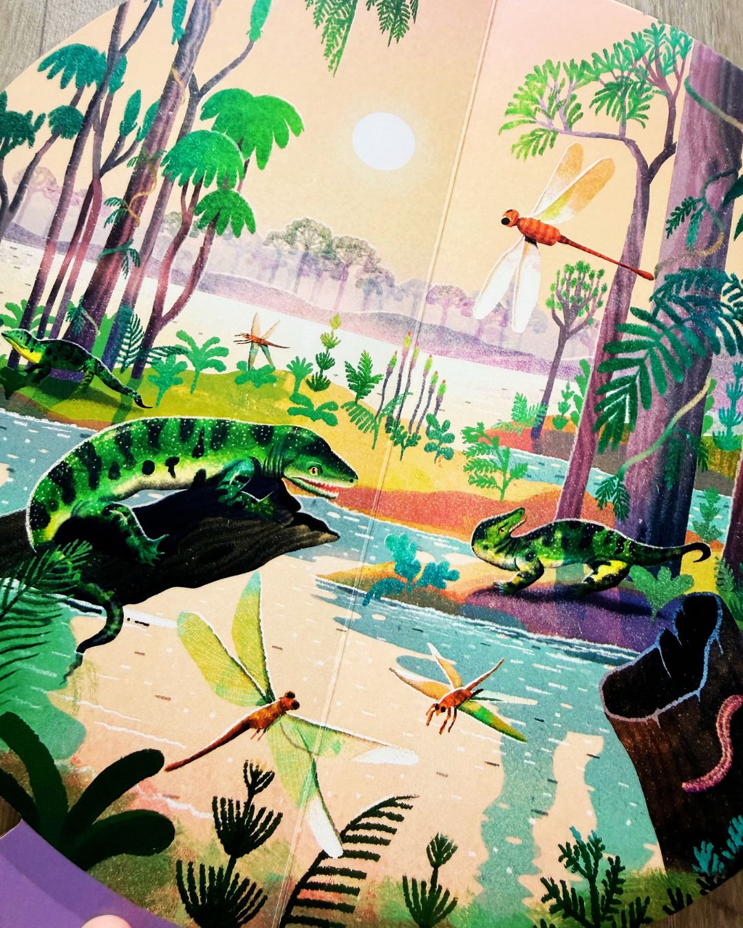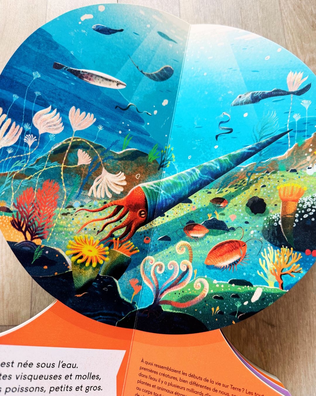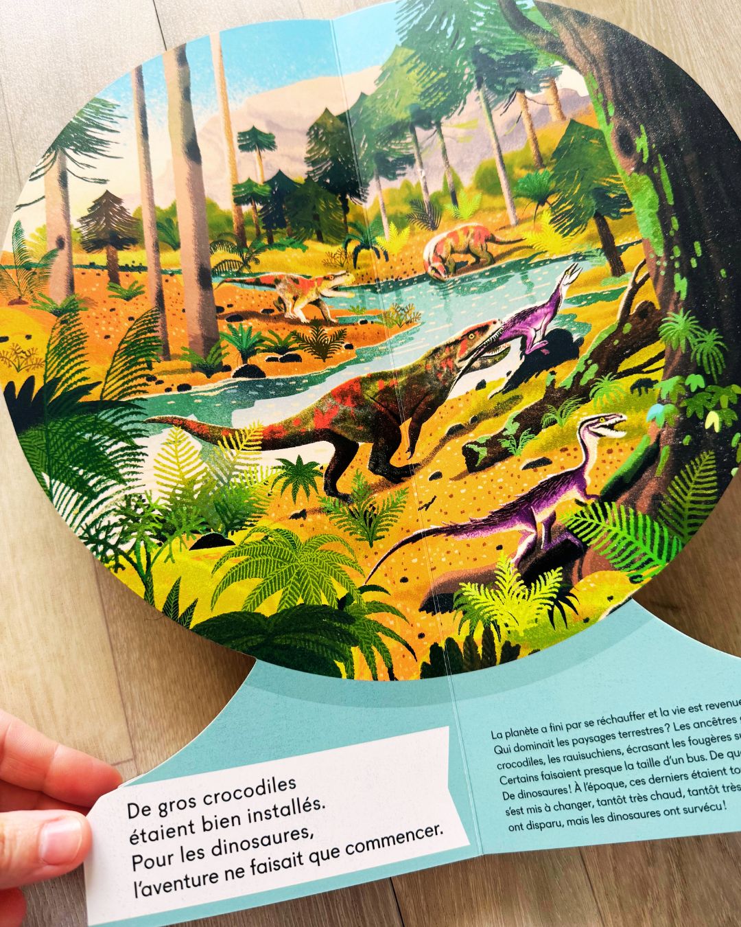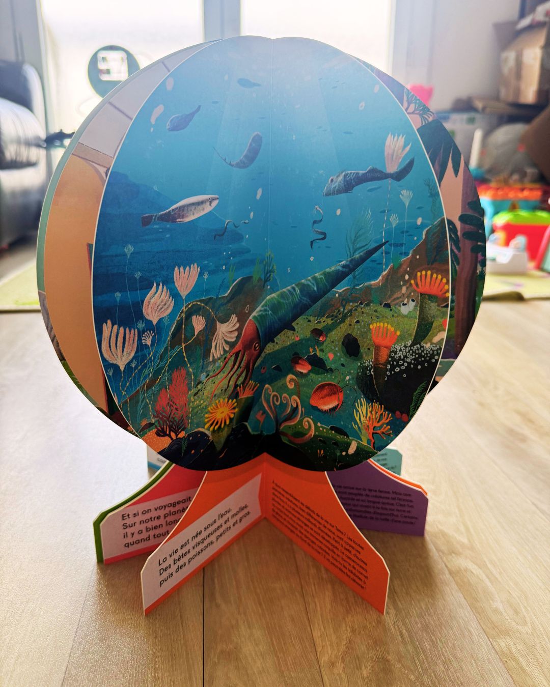 Dès les premières pages, ce livre invite les enfants à un véritable voyage dans le temps. Grâce à un texte en rimes pensé pour la lecture à voix haute, on découvre les dinosaures mais aussi les premières formes de vie qui ont peuplé la Terre. L’originalité du livre réside aussi dans son format : il s’ouvre pour former un globe, transformant la lecture en une expérience immersive et ludique. Au fil des pages, les jeunes lecteurs explorent les océans anciens, les terres sauvages et les créatures étonnantes qui vivaient il y a des millions d’années, accompagnés d’un contenu documentaire riche pour approfondir leurs découvertes.