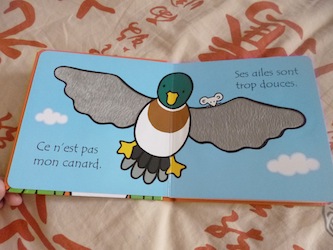 Ce livre est centré autour du canard. Personnellement, je déteste tout ce qui est volatile, alors bon, je suis un gramme moins enchanté par ce titre. Mais n’oublions pas que ce livre ne se destine pas à moi, la maman, mais aux tout petits !