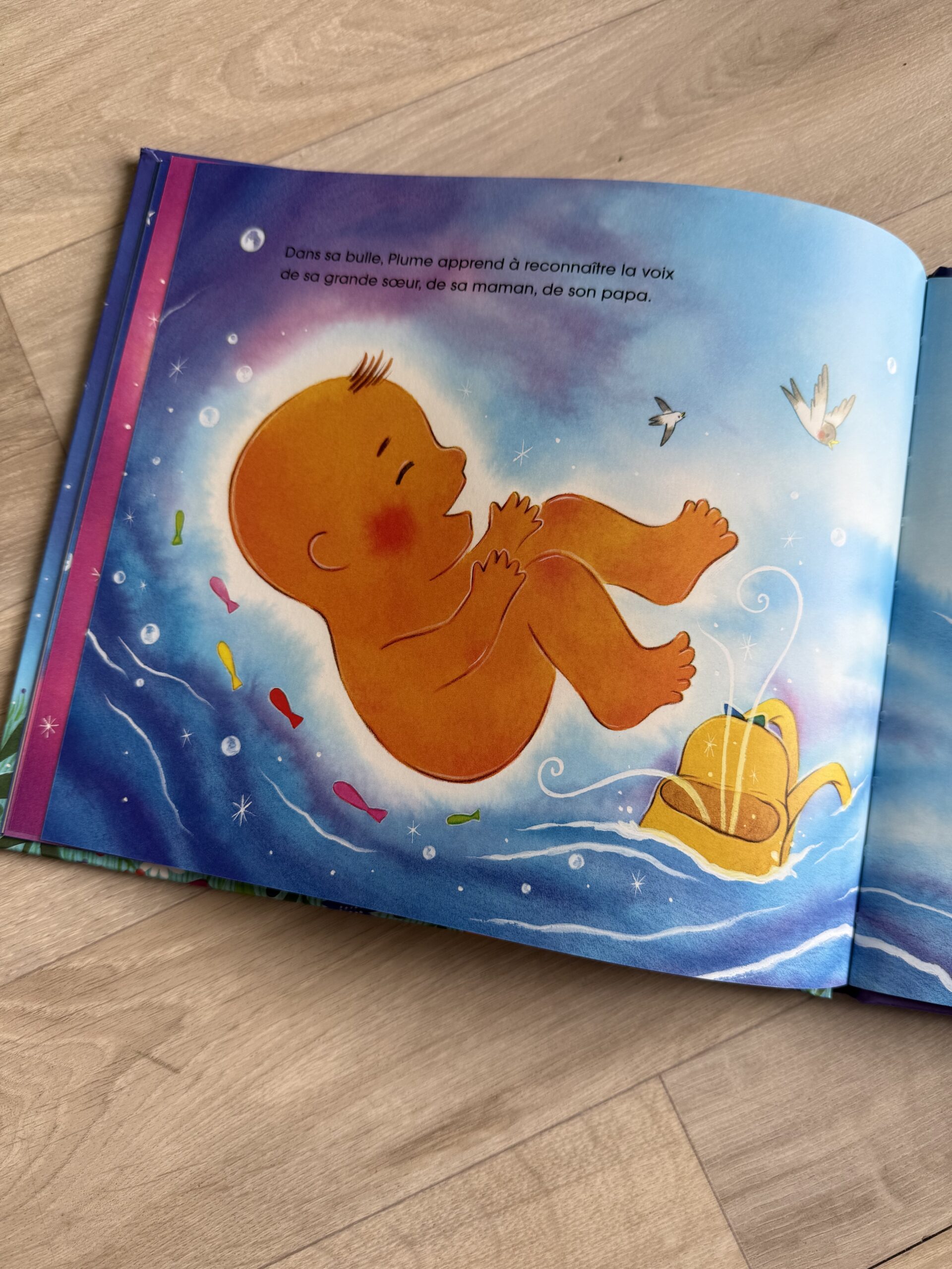 Aujourd’hui, j’aimerais vous parler d’un album tout particulier, plein d’émotion et de délicatesse. Cet album raconte l’histoire d’une famille qui attend un bébé. L’arrivée de cette petite lumière s’annonce pleine de promesses et de douceur… mais le destin en décide autrement. Malgré l’absence, la lumière de Plume continue de briller dans le cœur de ceux qui l’aimaient déjà. C’est un texte tout en pudeur, qui aborde avec justesse et poésie un sujet rarement évoqué dans les albums jeunesse : le deuil périnatal.