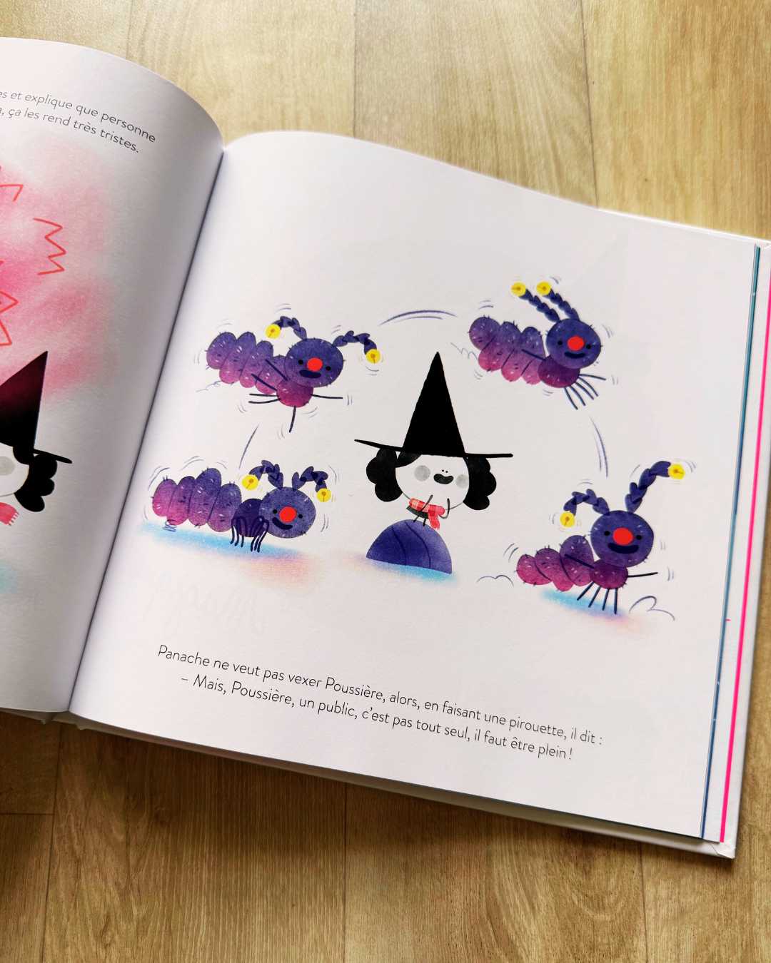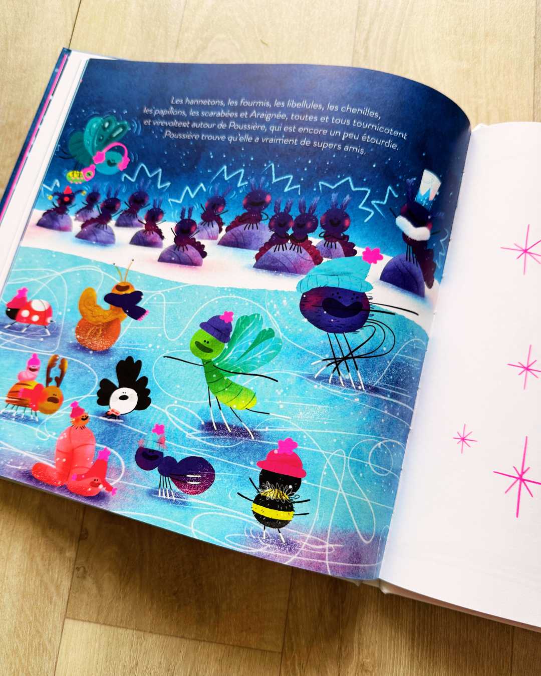 Présentation de cette histoire : Dans sa toute, toute petite forêt, Poussière, la toute, toute petite sorcière veille gentiment sur ses amis avant l’hiver. Mais quand tous se plaignent d’un mystérieux bruit les empêchant de dormir… à Poussière de jouer ! Oh, là ! des puces de neige organisent un spectacle ! Et si toute la petite forêt faisait un grand spectacle avant de retourner tranquillement au dodo ?