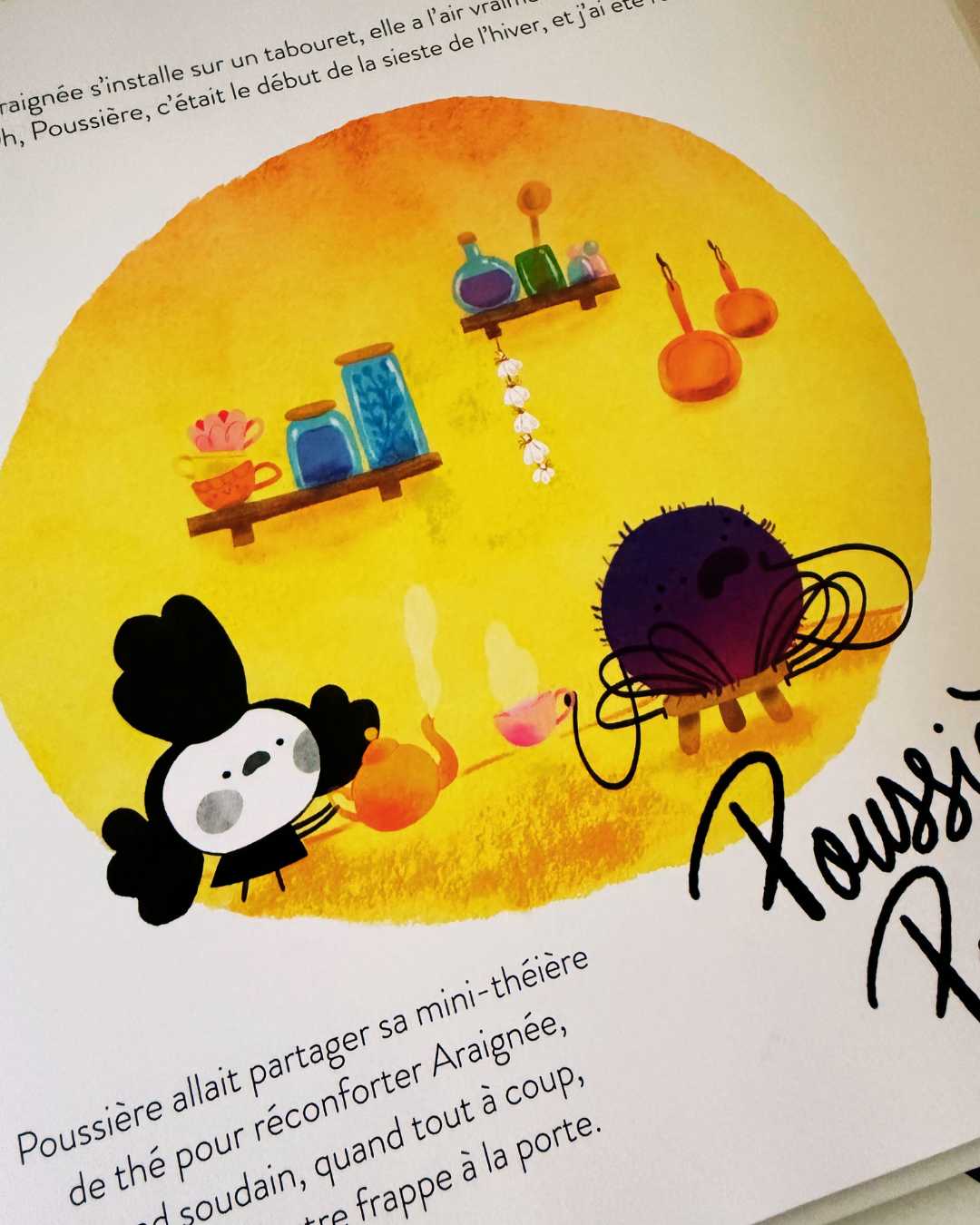 J’ai été immédiatement touchée par l’atmosphère du livre. On retrouve cette jolie ambiance du premier album, Poussière Crapaud et ver de terre. Il s’en dégage une grande douceur, presque enveloppante, qui apaise autant l’adulte lecteur que l’enfant. Le texte est bien écrit, c’est vraiment une histoire apaisante mais aussi entrainante grâce à notre petit héroïne pleine de bonne volonté et de courage. C’est un album que l’on prend plaisir à relire, notamment quand les journées raccourcissent et que l’on a soi-même envie de lever un peu le pied.
