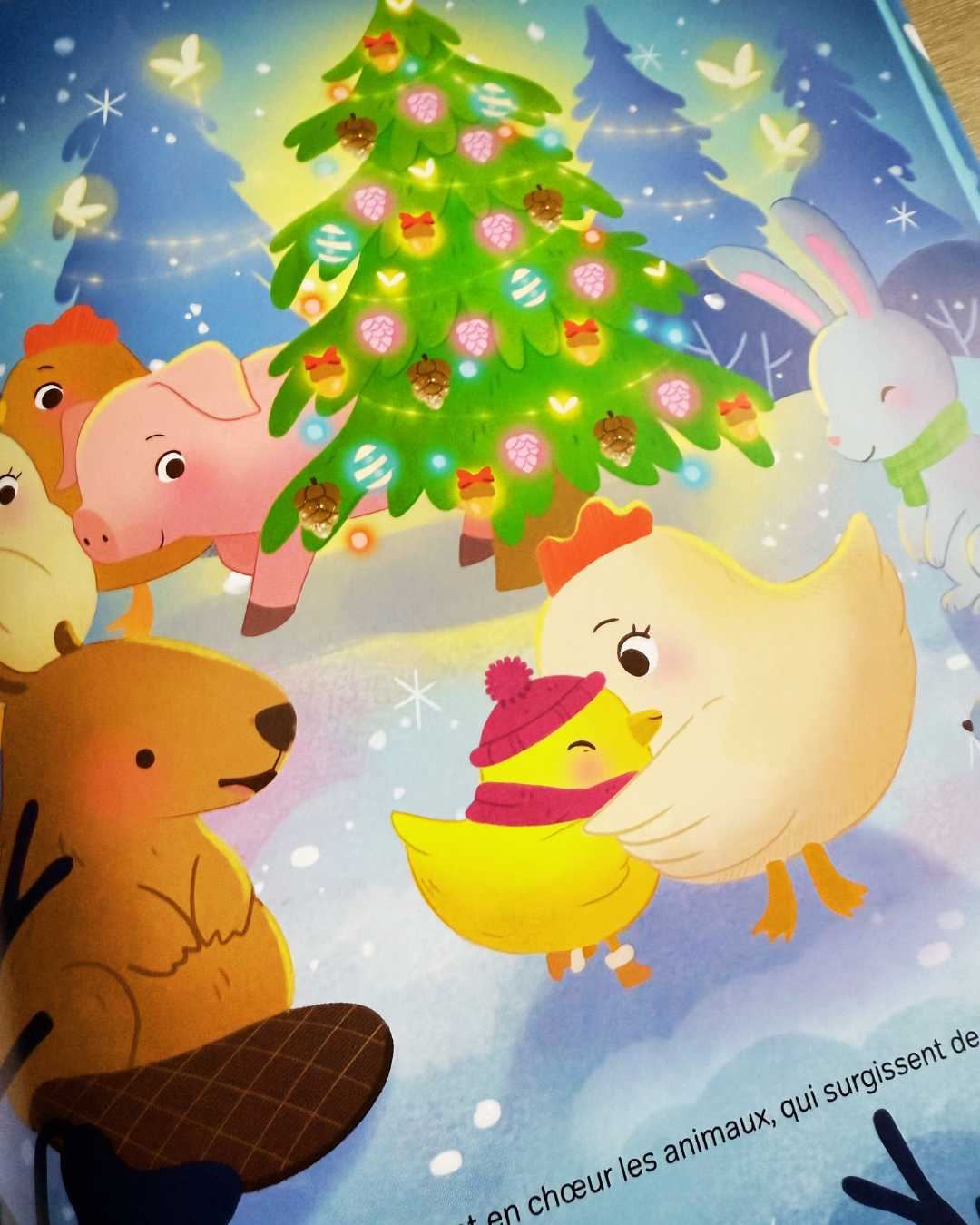 Présentation de cette histoire : Par une nuit de décembre, Poussin aperçoit des lumières étranges qui émanent du salon de la ferme. Curieux, il grimpe jusqu’à la fenêtre et fait une découverte éblouissante: un arbre scintillant de mille feux. Maman Poule lui explique que chaque année, les humains décorent un sapin pour célèbrer Noël. Poussin est tout excité ; lui aussi veut aussi son sapin de Noël…