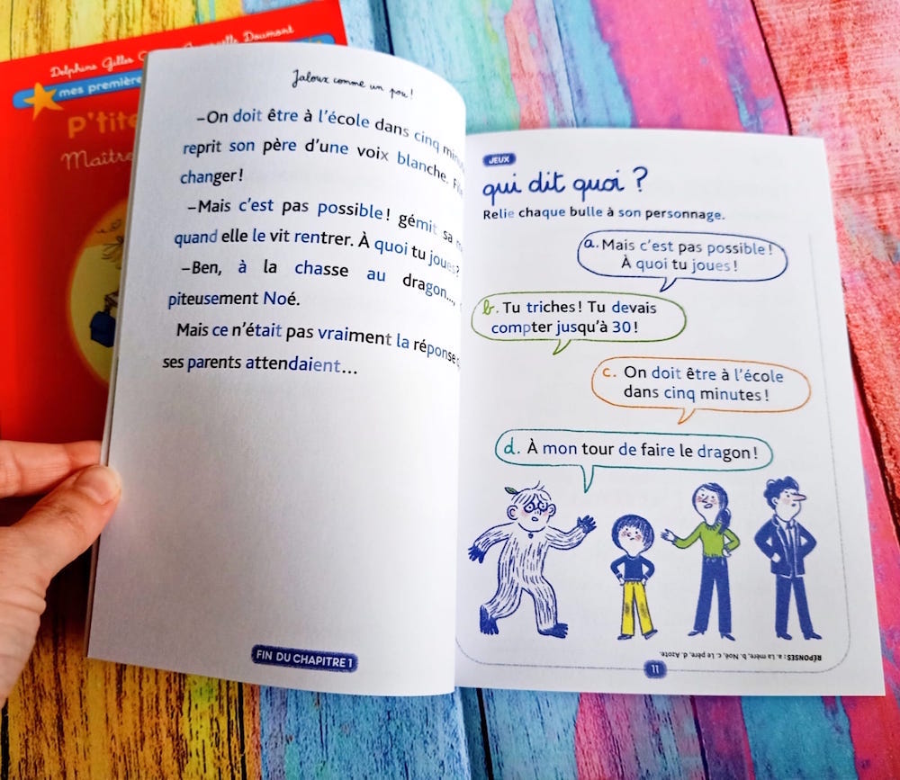 Ce qui est chouette avec cette collection, c’est qu’il y a des syllabes en couleur, et les lettres muettes sont atténuées. cela va beaucoup aider les enfants qui auraient besoin de repères dans la lecture. De pus, on retrouve également de nombreux petits jeux de compréhension après chaque chapitre. C’est un petit moment de détente pour eux, mais qui permet également de voir si l’enfant comprend ce qu’il lit.