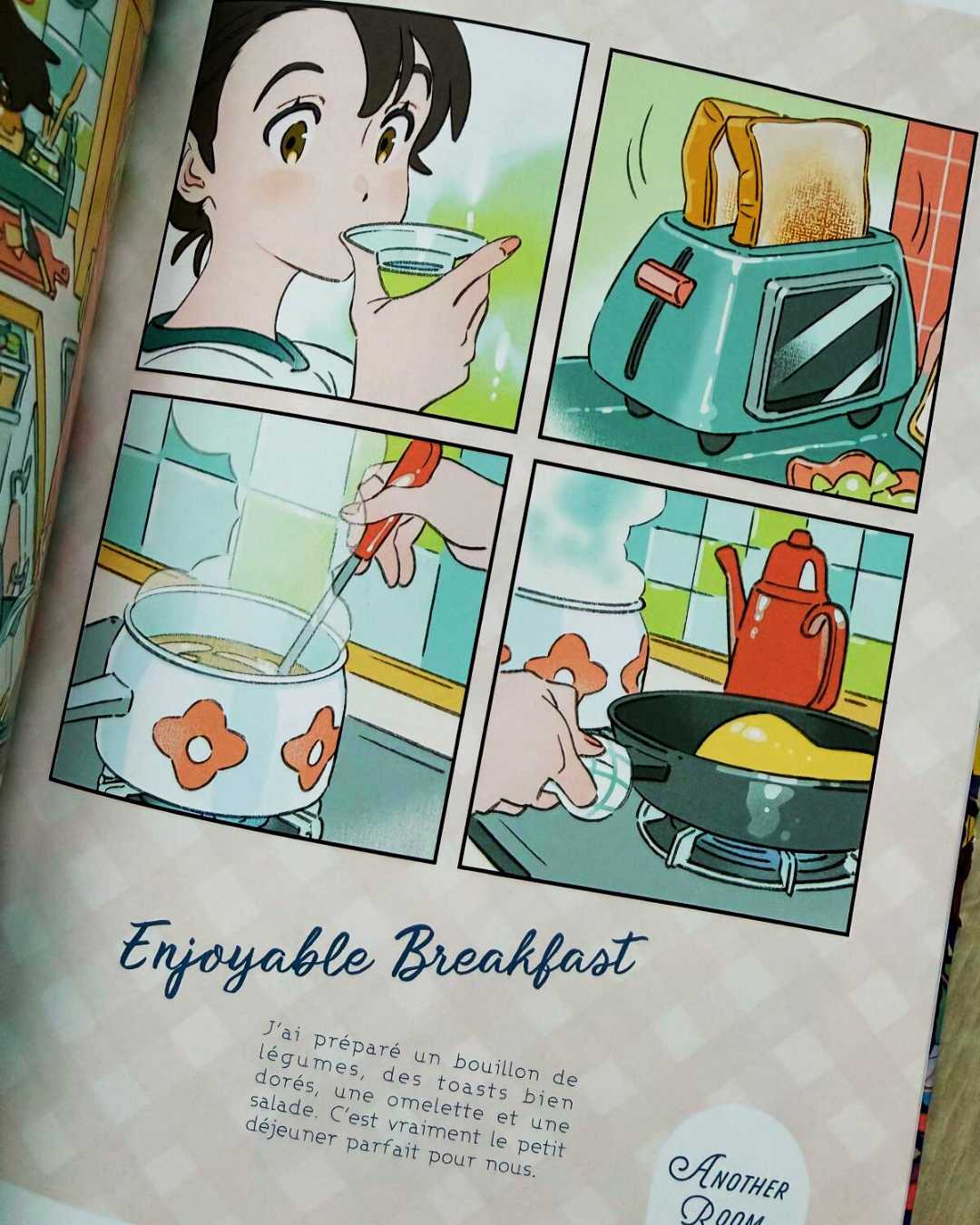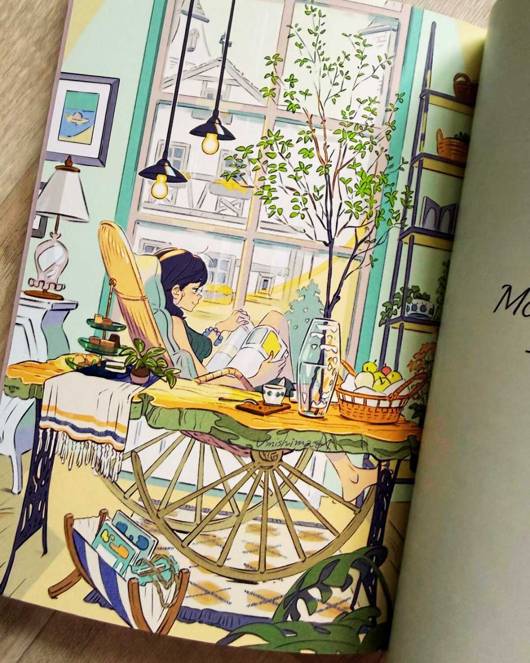 Les illustrations sont sans doute le plus grand point fort de cet artbook. Les couleurs sont harmonieuses, souvent douces mais jamais fades, et les compositions extrêmement travaillées. Chaque pièce est remplie d’objets, de motifs, de textures qui donnent envie de s’attarder longuement sur chaque page. Les personnages, lorsqu’ils sont présents, semblent vivre naturellement dans ces espaces, renforçant cette impression d’instant suspendu. On sent un véritable amour du détail et de l’ambiance.