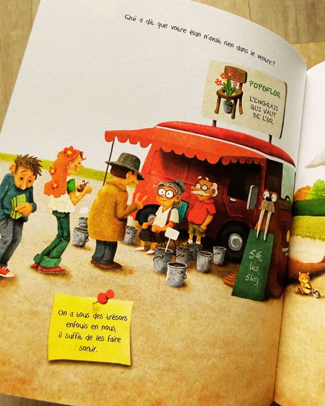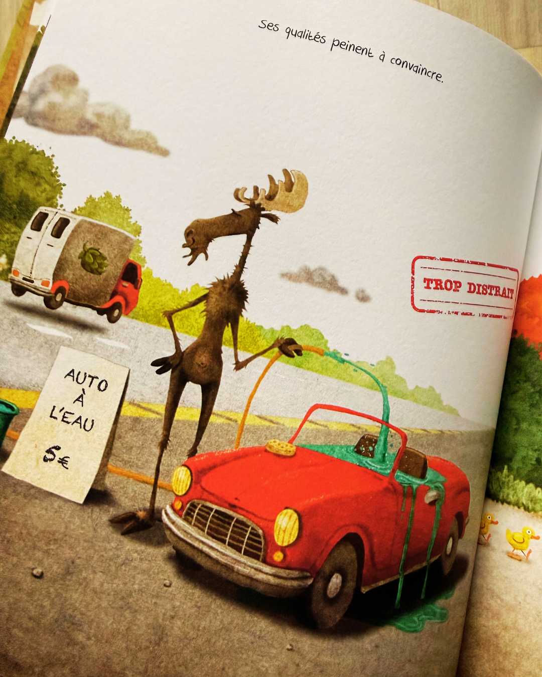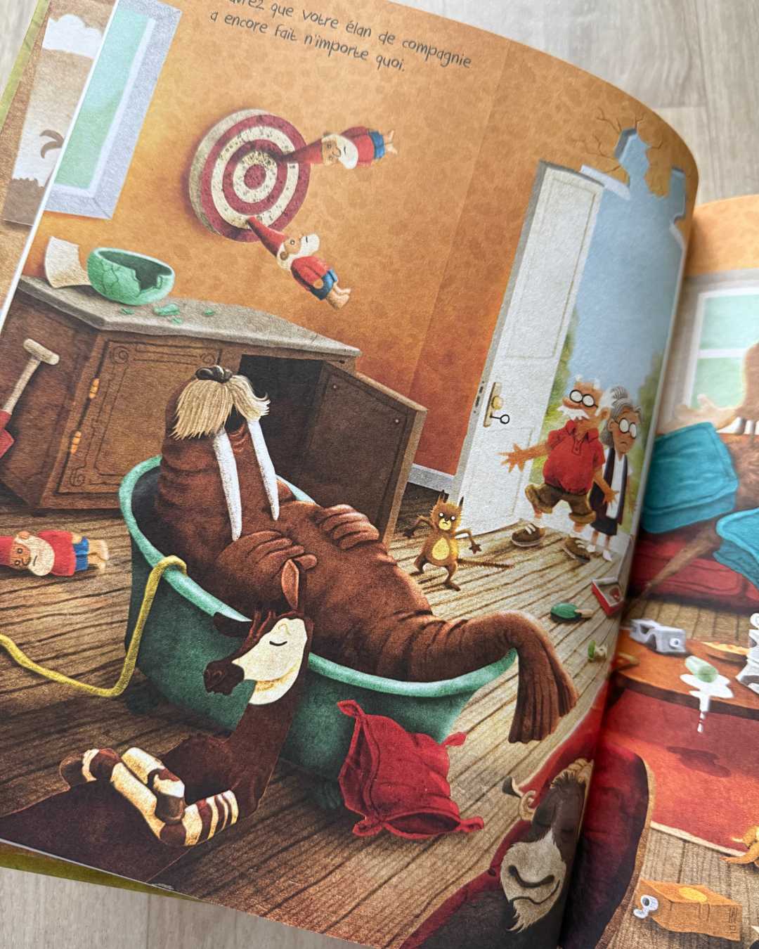 Les illustrations d’Arnold Hovart renforcent parfaitement le propos. L’élan, étalé au milieu du désordre, est immédiatement attachant et rigolo. Les scènes sont riches en détails, pleines de mouvement et d’expressions qui racontent autant que le texte. Les couleurs naturelles, l’herbe, les fleurs et le joyeux bazar ambiant créent un contraste savoureux entre l’urgence de la situation… et l’inertie totale des personnages. Un vrai plaisir pour les yeux.