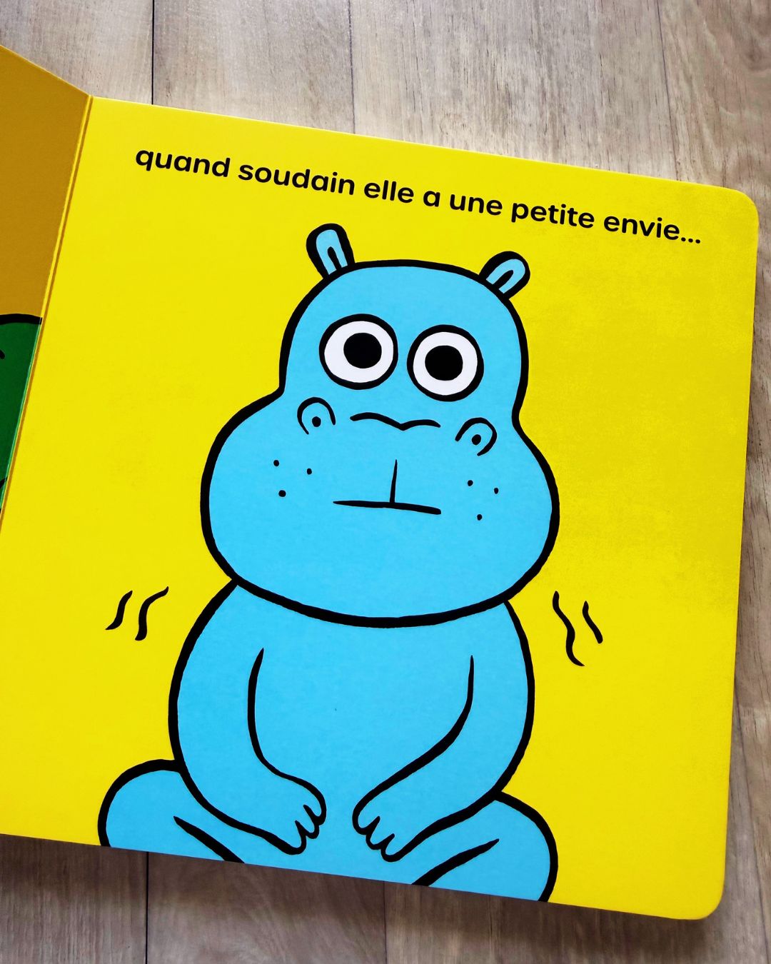 Ce petit livre met en scène Petite Hippo, un personnage attachant confronté à une situation du quotidien bien connue des tout-petits : une petite envie… qui devient de plus en plus pressante ! L’histoire suit ce moment avec beaucoup de justesse : l’urgence monte, il faut vite trouver le pot… et enfin, le soulagement arrive. En quelques mots simples et efficaces, l’album raconte une étape clé de l’apprentissage de la propreté.